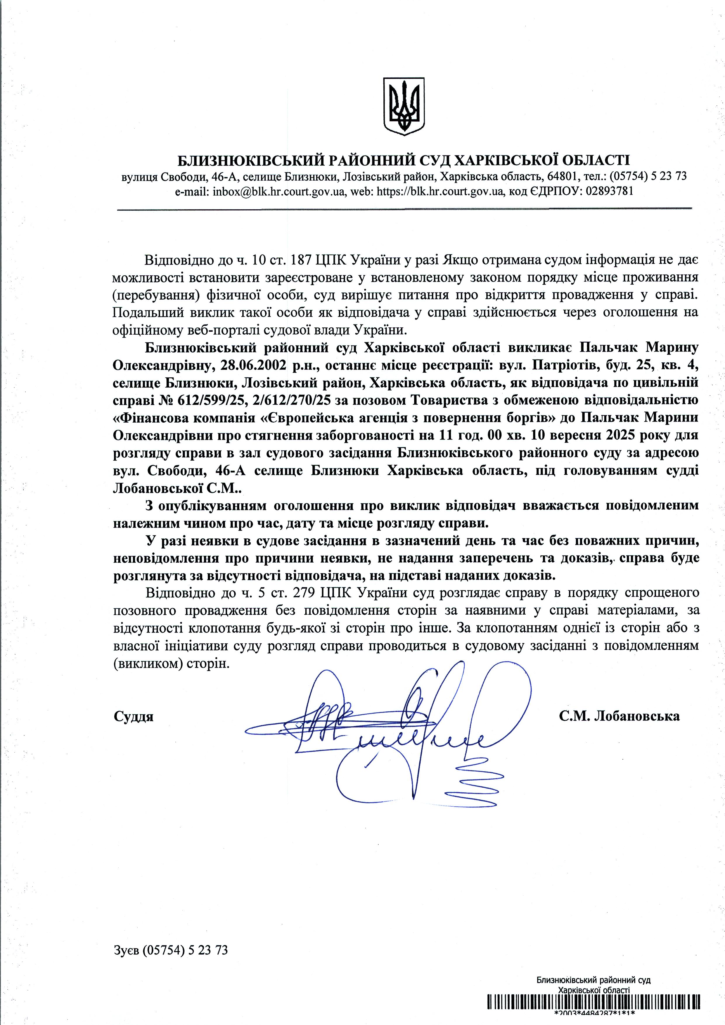 Оголошення про виклик до суду Пальчак Марину Олександрівну на 11год. 00хв. 10 вересня 2025 року по справі № 612/599/25 суддя Лобановська С.М.