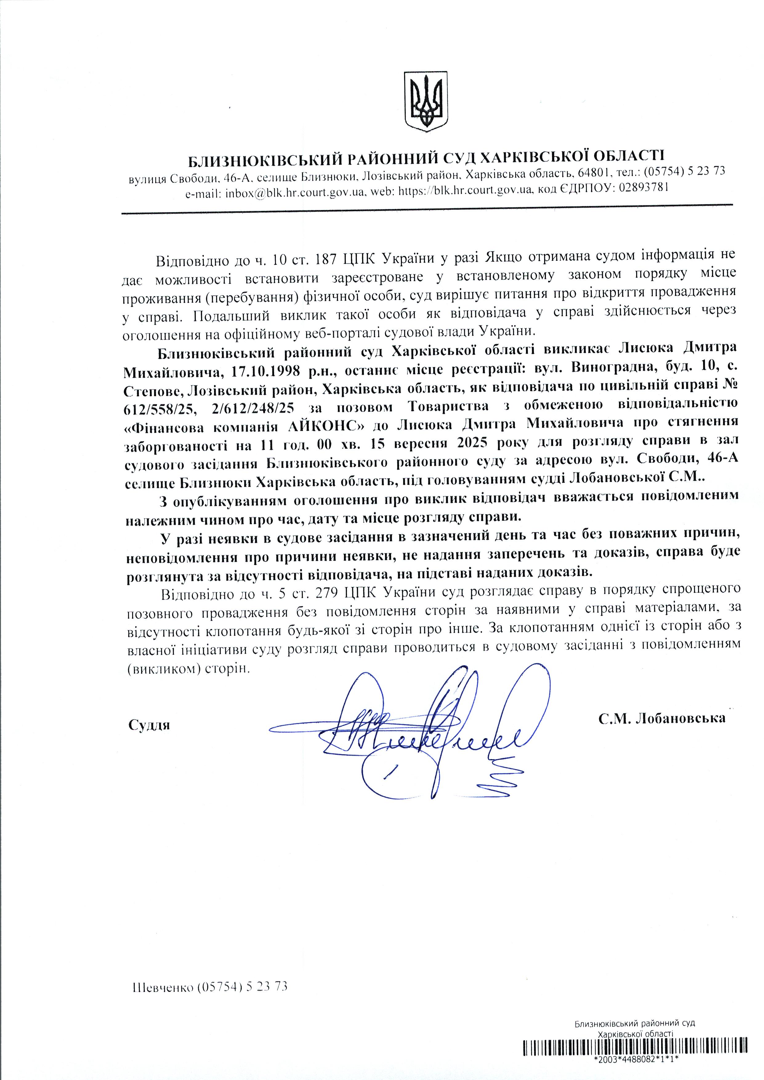 Оголошення про виклик до суду Лисюка Дмитра Михайловича на 11год. 00хв. 15 вересня 2025 року по справі № 612/558/25 суддя Лобановська С.М.