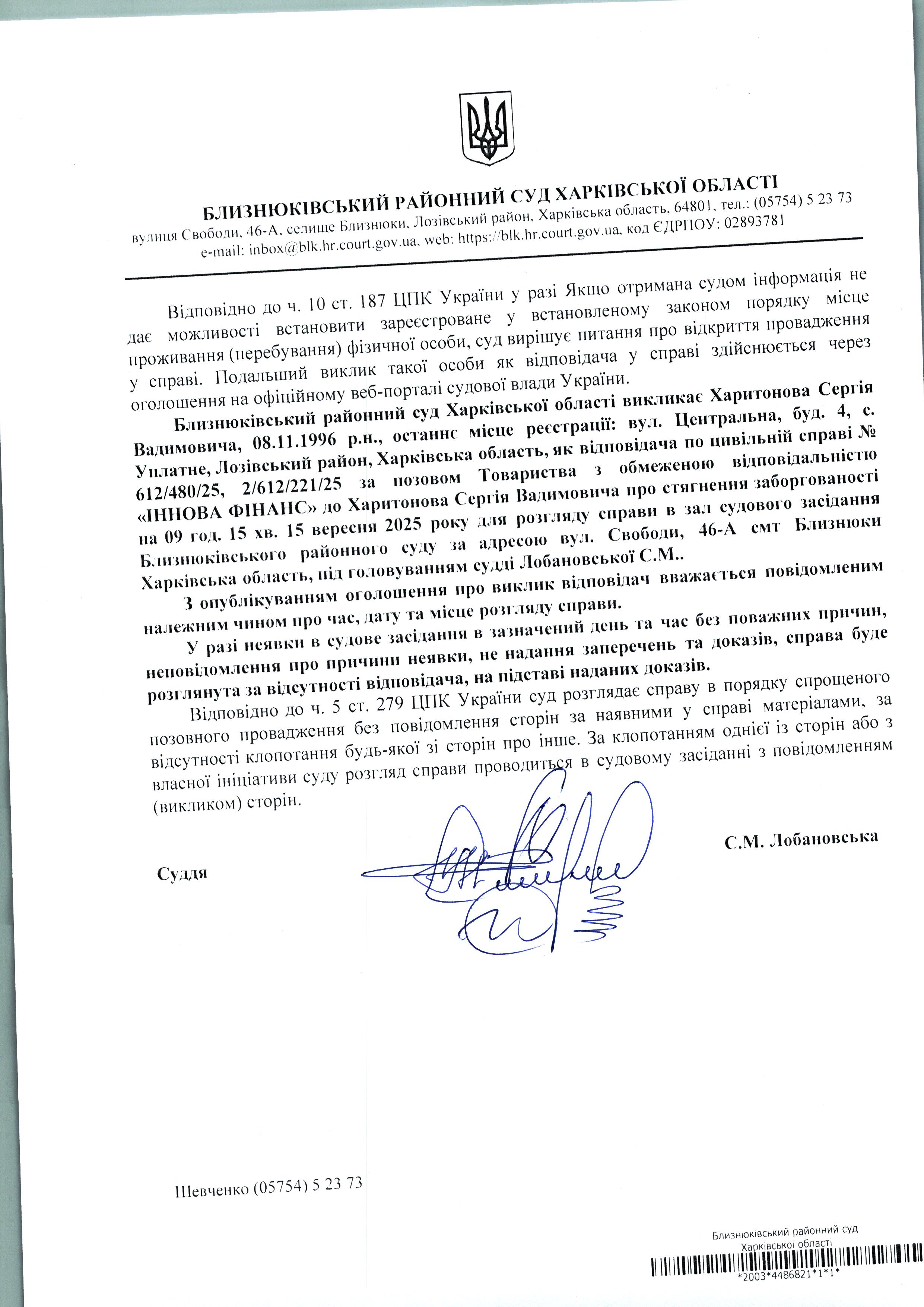Оголошення про виклик до суду Харитонова Сергія Вадимовича на 09год. 15хв. 15 вересня 2025 року по справі № 612/480/25 суддя Лобановська С.М.