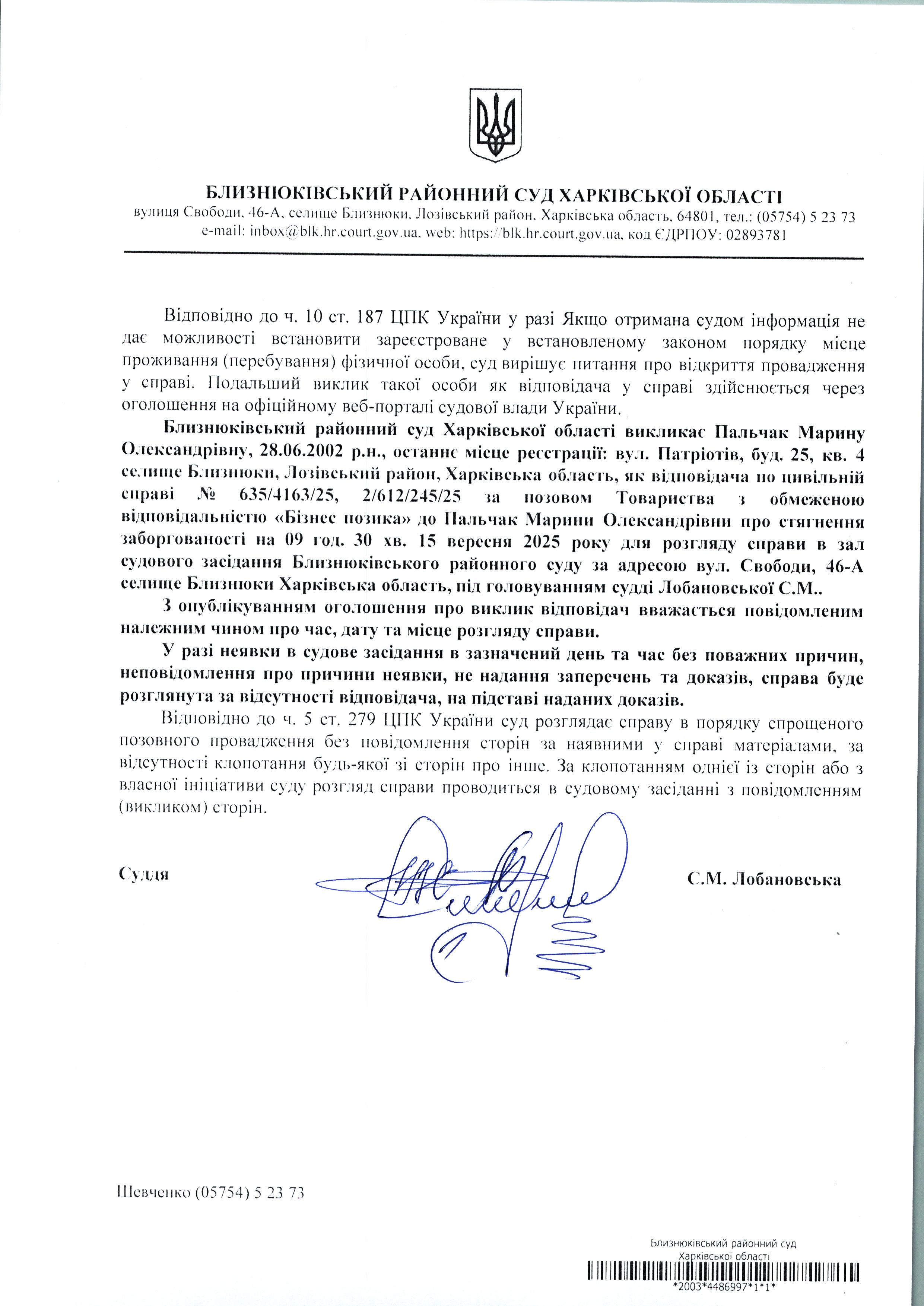Оголошення про виклик до суду Пальчак Марину Олександрівну на 09год. 30хв. 15 вересня 2025 року по справі № 635/4163/25 суддя Лобановська С.М.