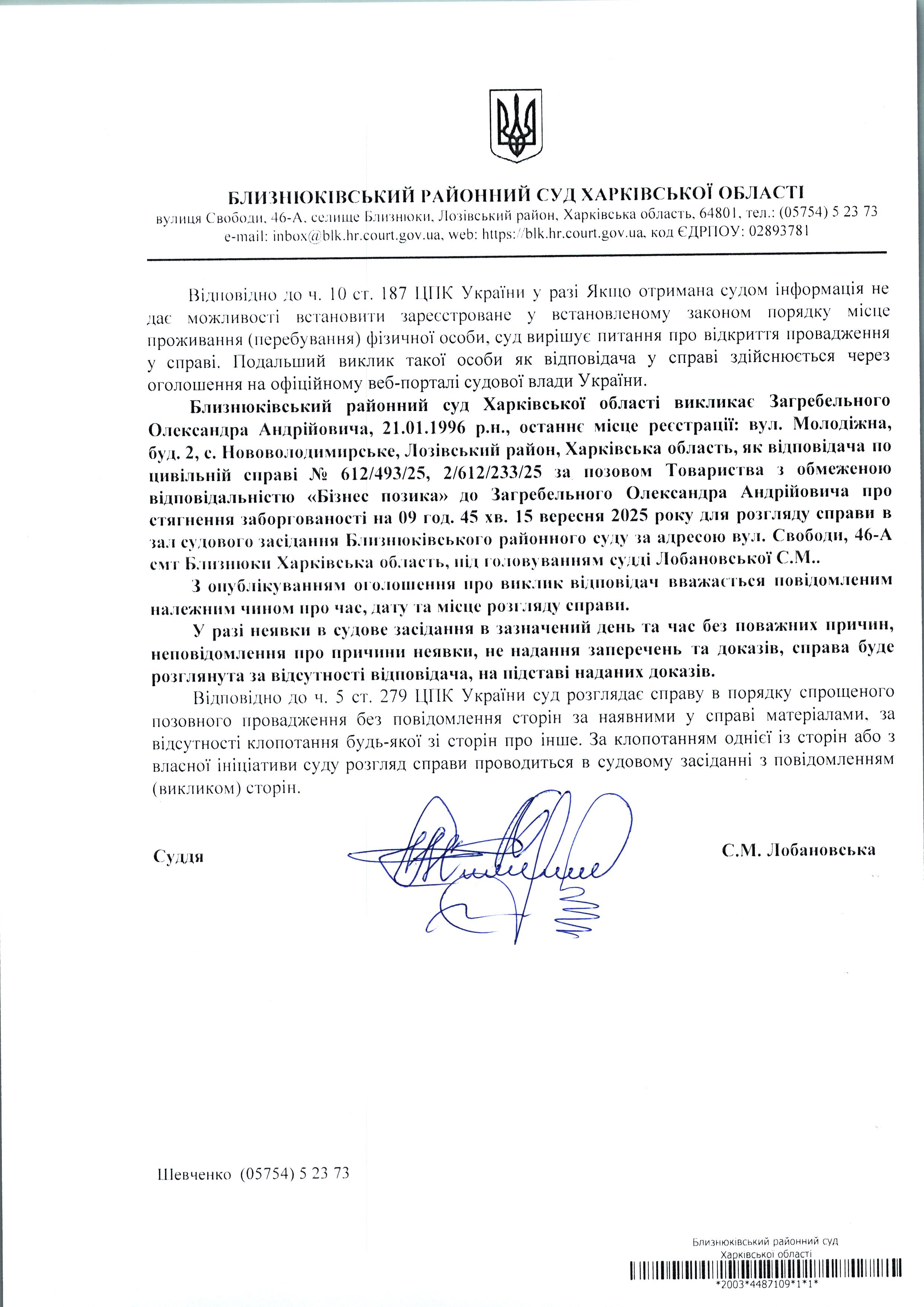 Оголошення про виклик до суду Загребельного Олександра Андрійовича на 09год. 45хв. 15 вересня 2025 року по справі № 612/493/25 суддя Лобановська С.М.