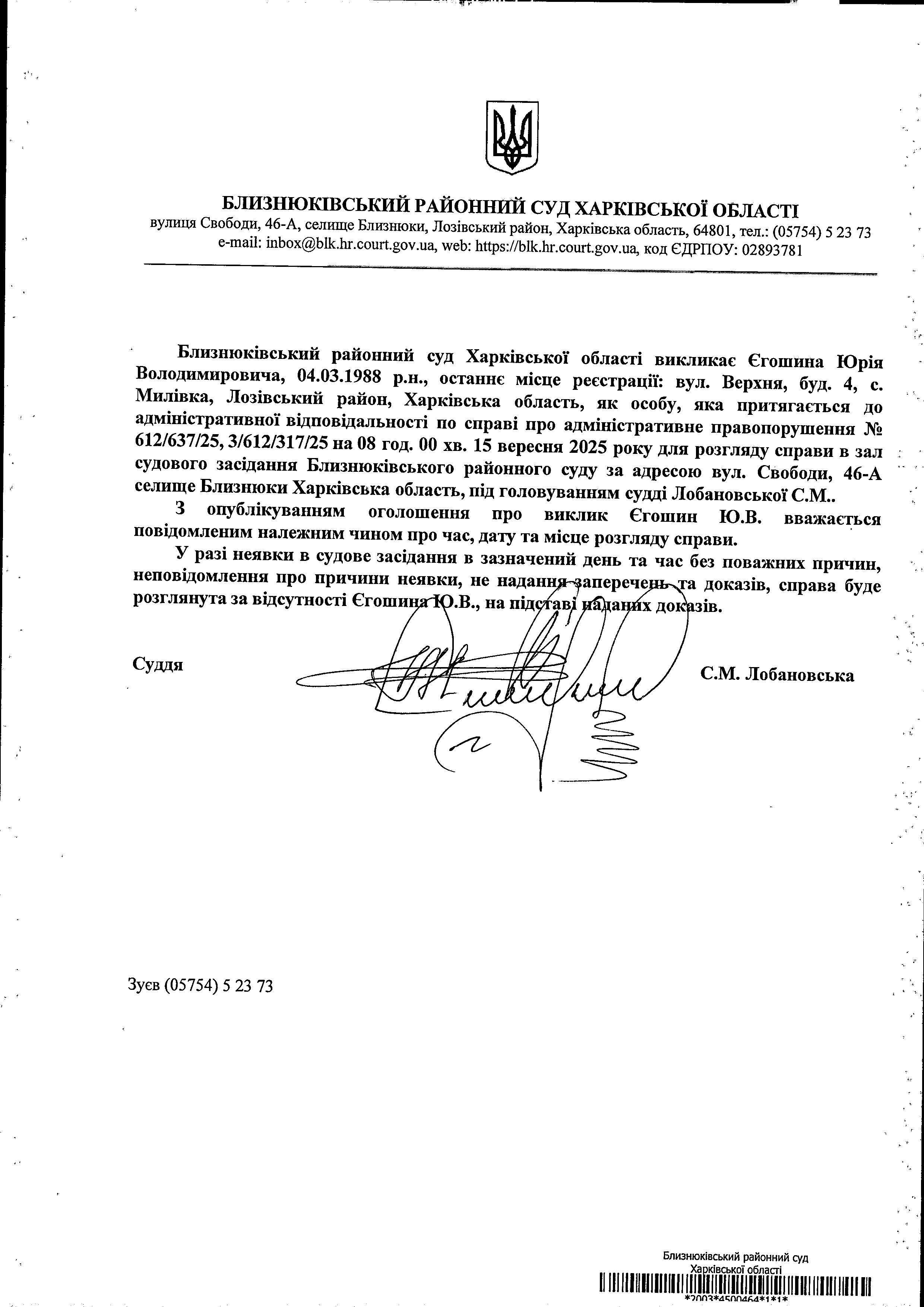 Оголошення про виклик до суду Єгошина Юрія Володимировича на 08год. 00хв. 15 вересня 2025 року по справі № 612/637/25 суддя Лобановська С.М.