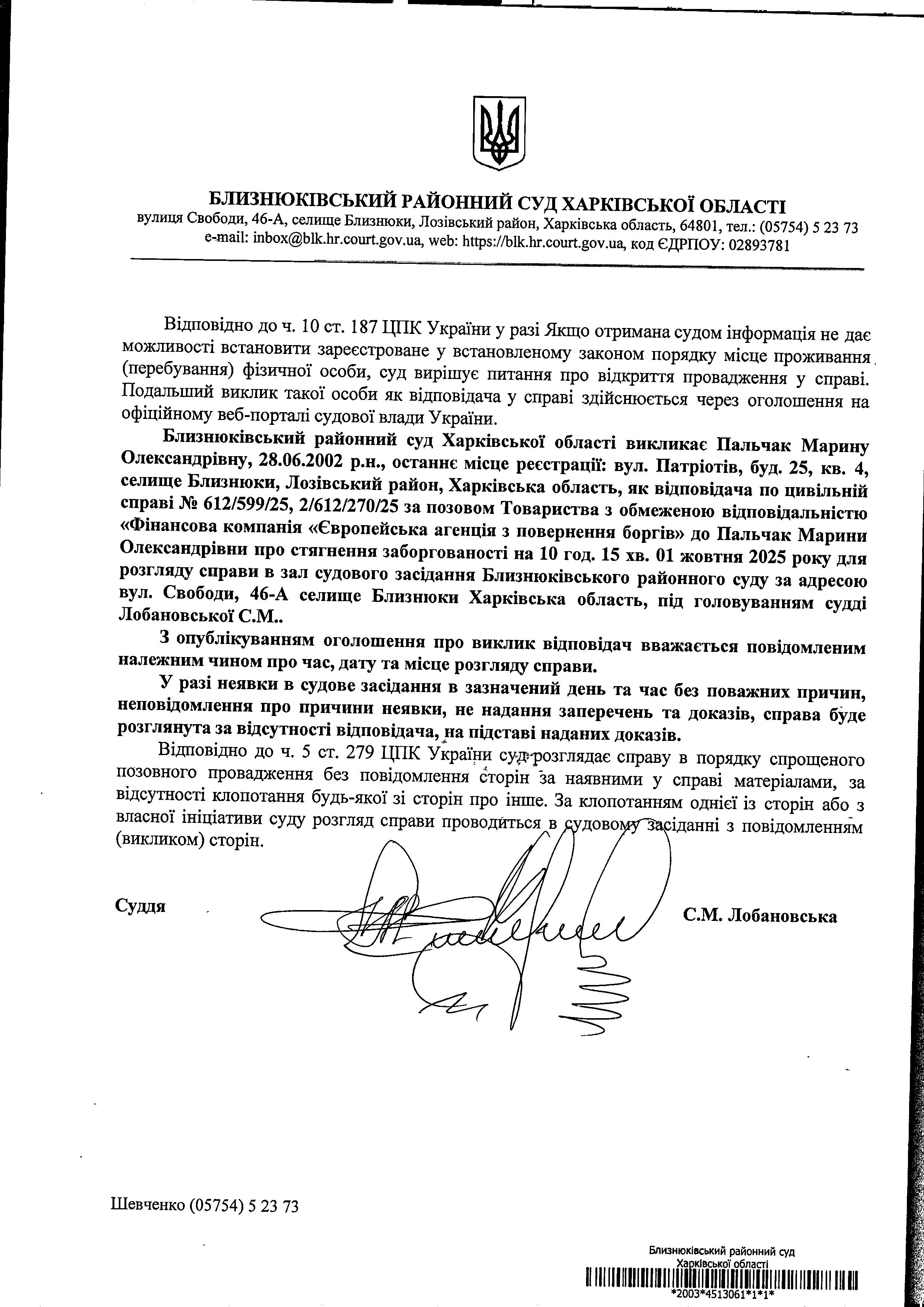 Оголошення про виклик до суду Пальчак Марину Олександрівну на 10год. 15хв. 1 жовтня 2025 року по справі № 612/599/25 суддя Лобановська С.М.