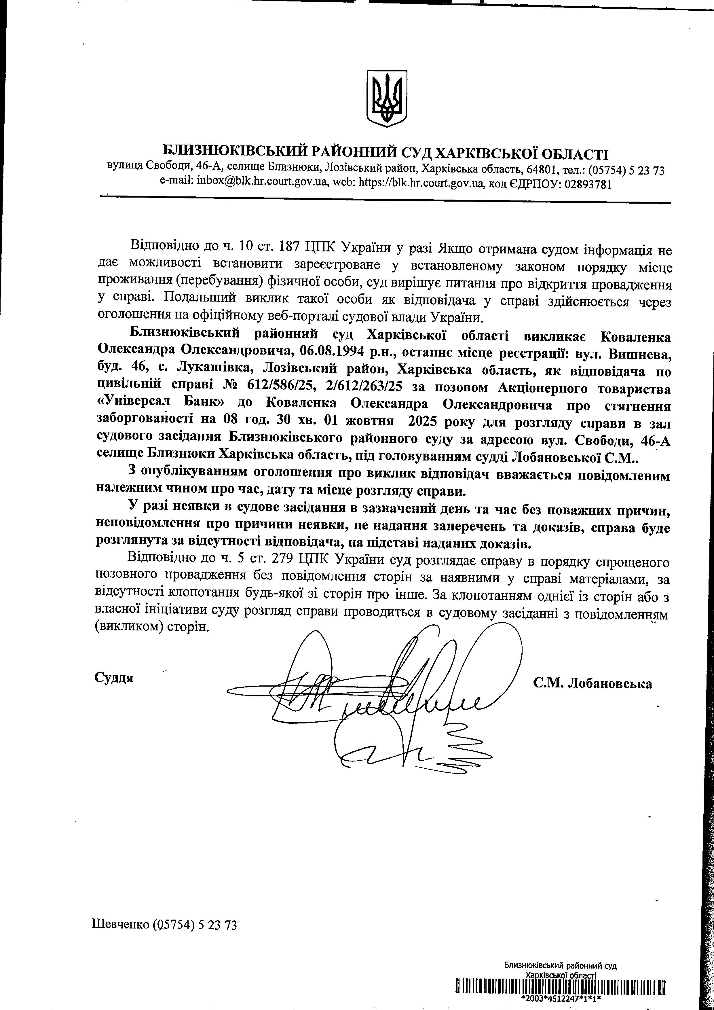 Оголошення про виклик до суду Коваленка Олександра Олександровича на 08год. 30хв. 1 жовтня 2025 року по справі № 612/586/25 суддя Лобановська С.М.