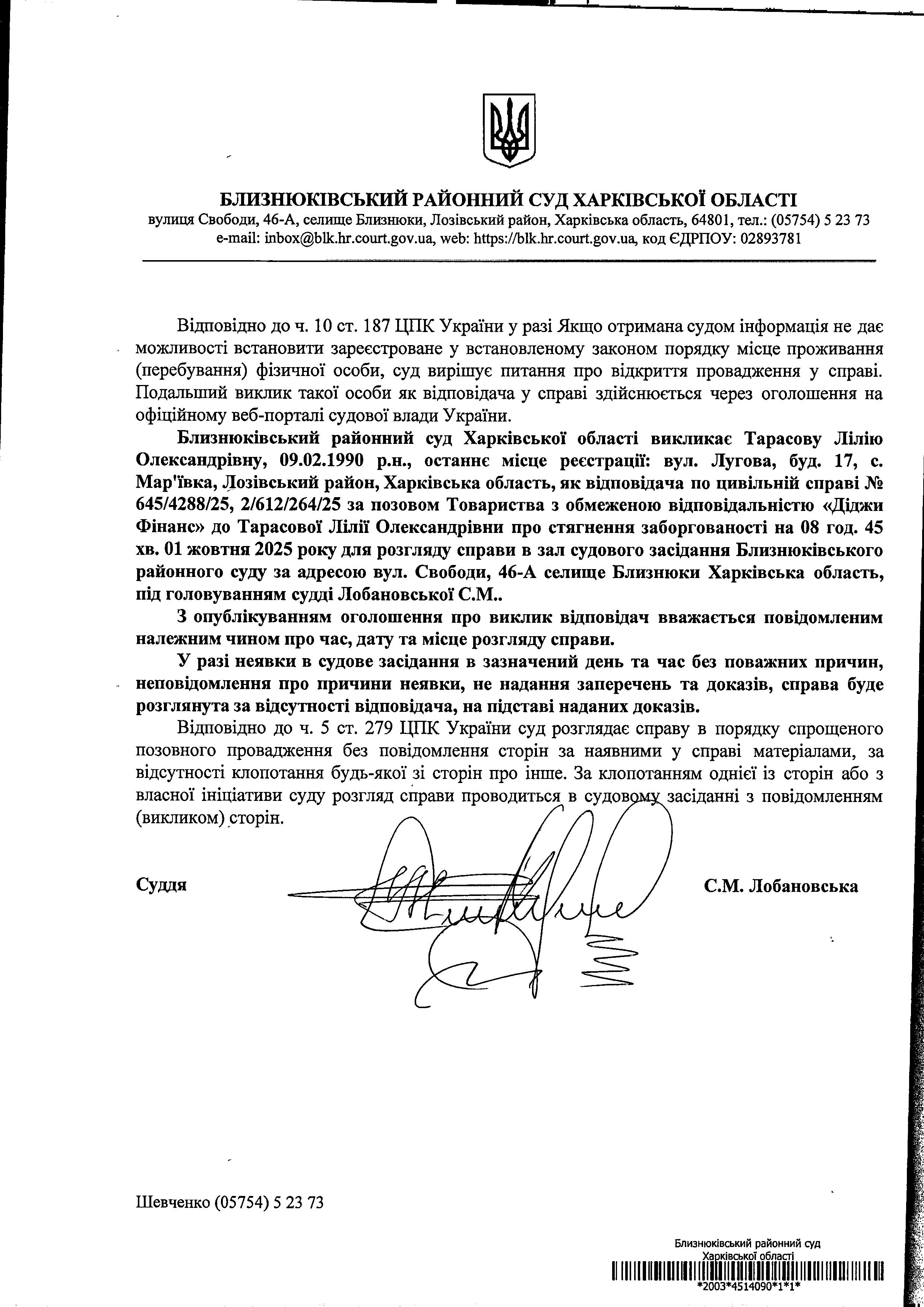 Оголошення про виклик до суду Тарасову Лілію Олександрівну на 08год. 45хв. 1 жовтня 2025 року по справі № 645/4288/25 суддя Лобановська С.М.