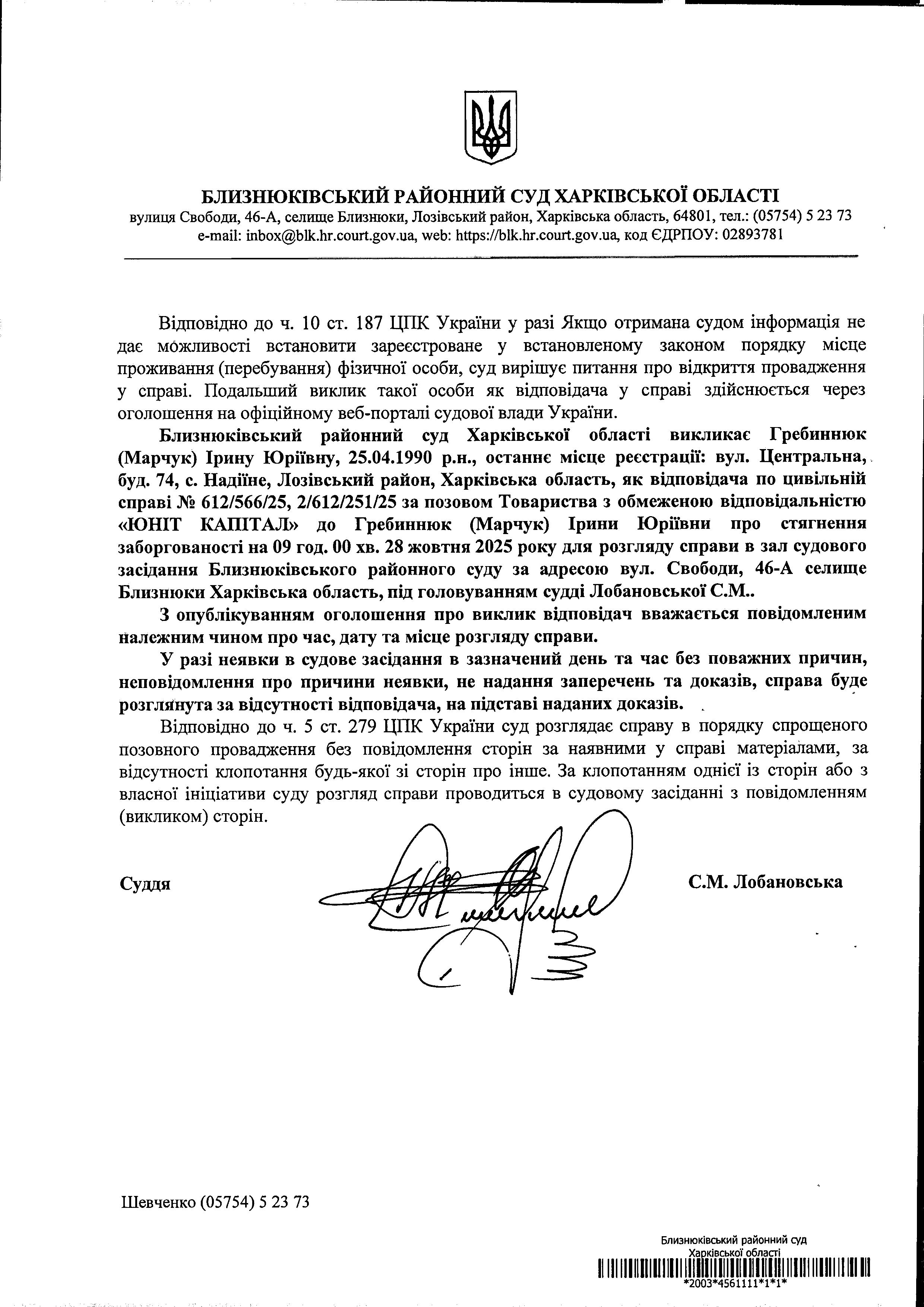 Оголошення про виклик до суду Гребеннюк (Марчук) Ірину Юріївну на 09год. 00хв. 28 жовтня 2025 року по справі № 612/566/25 суддя Лобановська С.М.