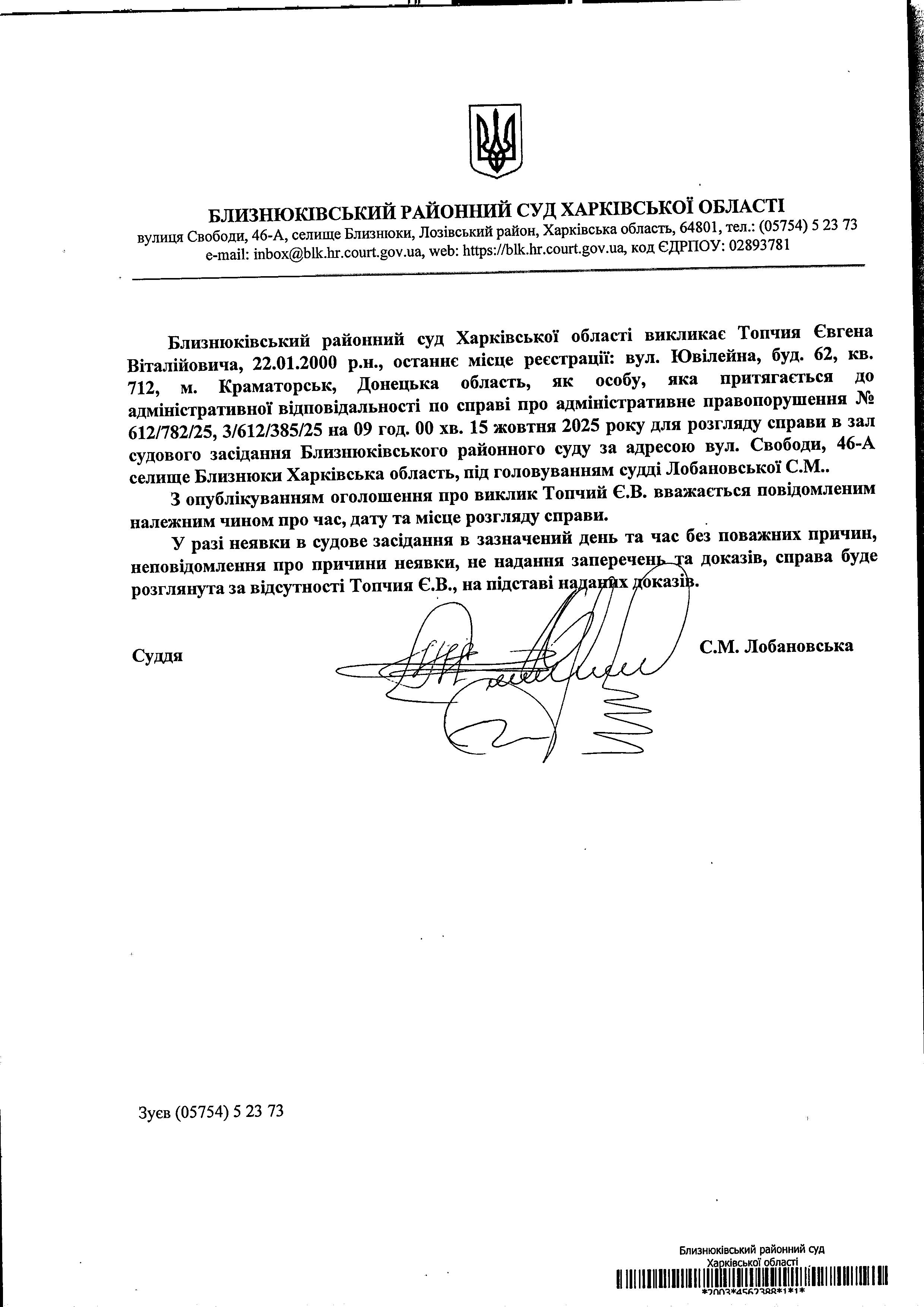 Оголошення про виклик до суду Топчія Євгена Віталійовича на 09год. 00хв. 15 жовтня 2025 року по справі № 612/782/25 суддя Лобановська С.М.