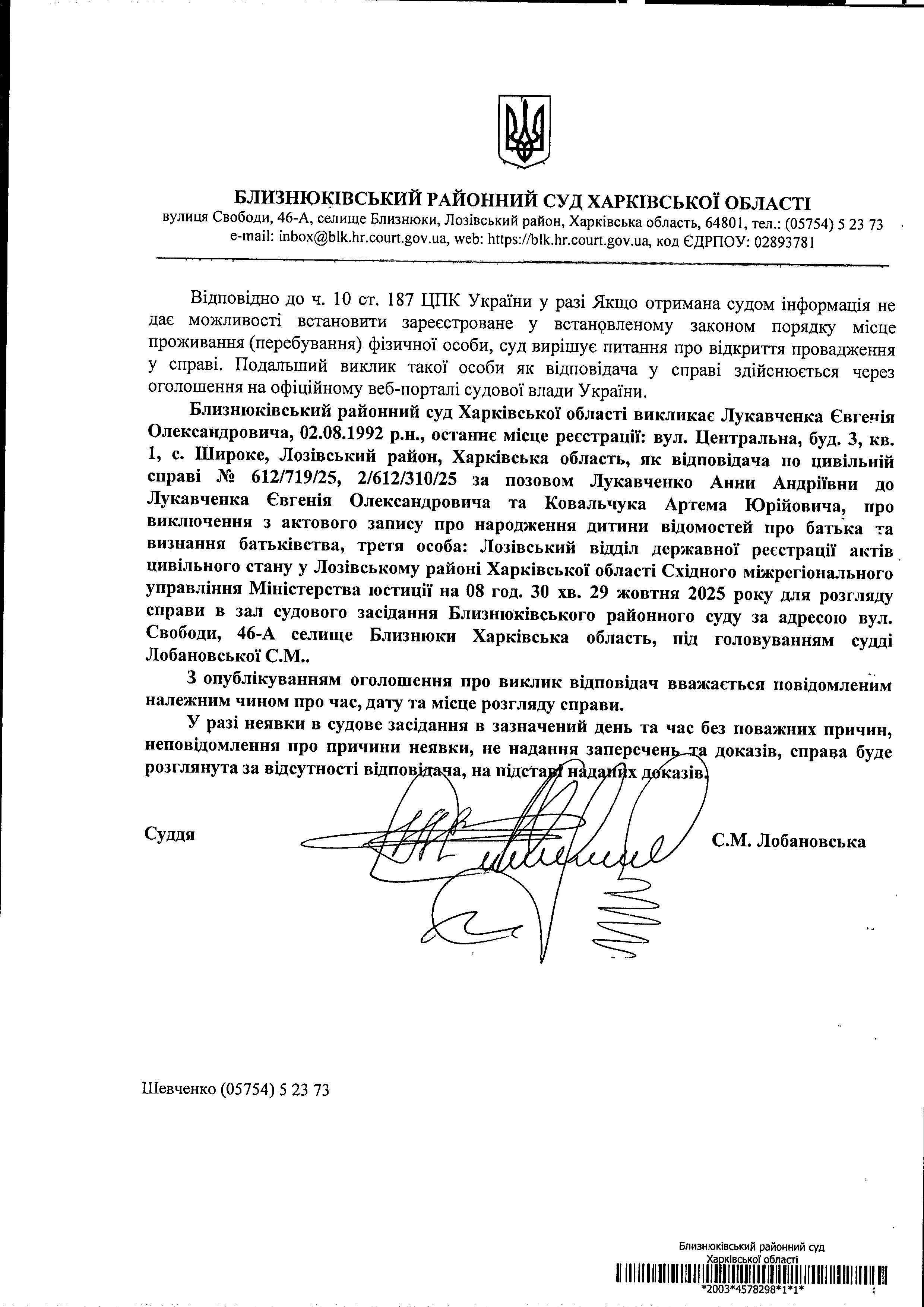 Оголошення про виклик до суду Лукавченка Євгенія Олександровича на 08год. 30хв. 29 жовтня 2025 року по справі № 612/719/25 суддя Лобановська С.М.