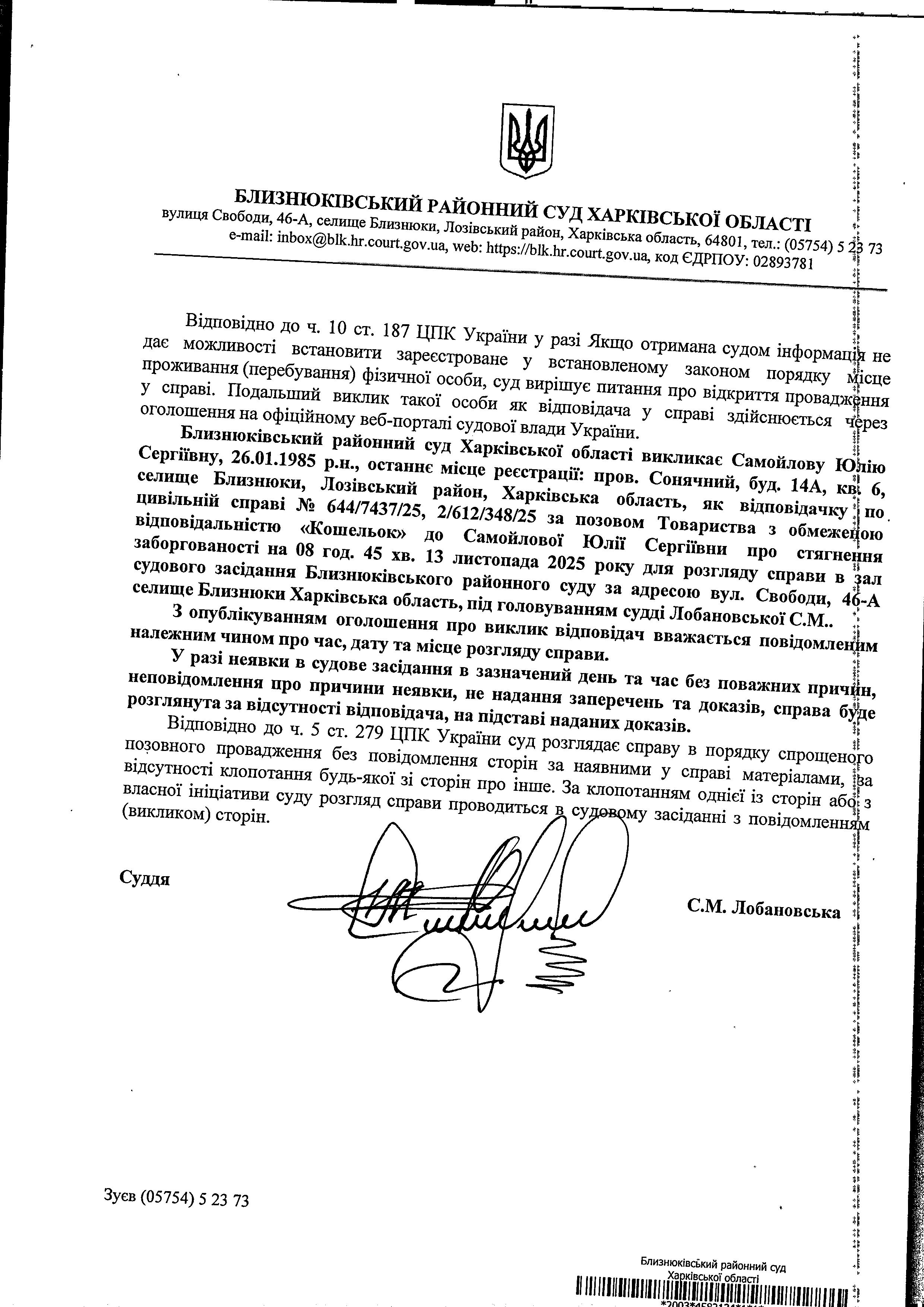 Оголошення про виклик до суду Самойлову Юлію Сергіївну на 08год. 45хв. 13 листопада 2025 року по справі № 612/813/25 суддя Лобановська С.М.