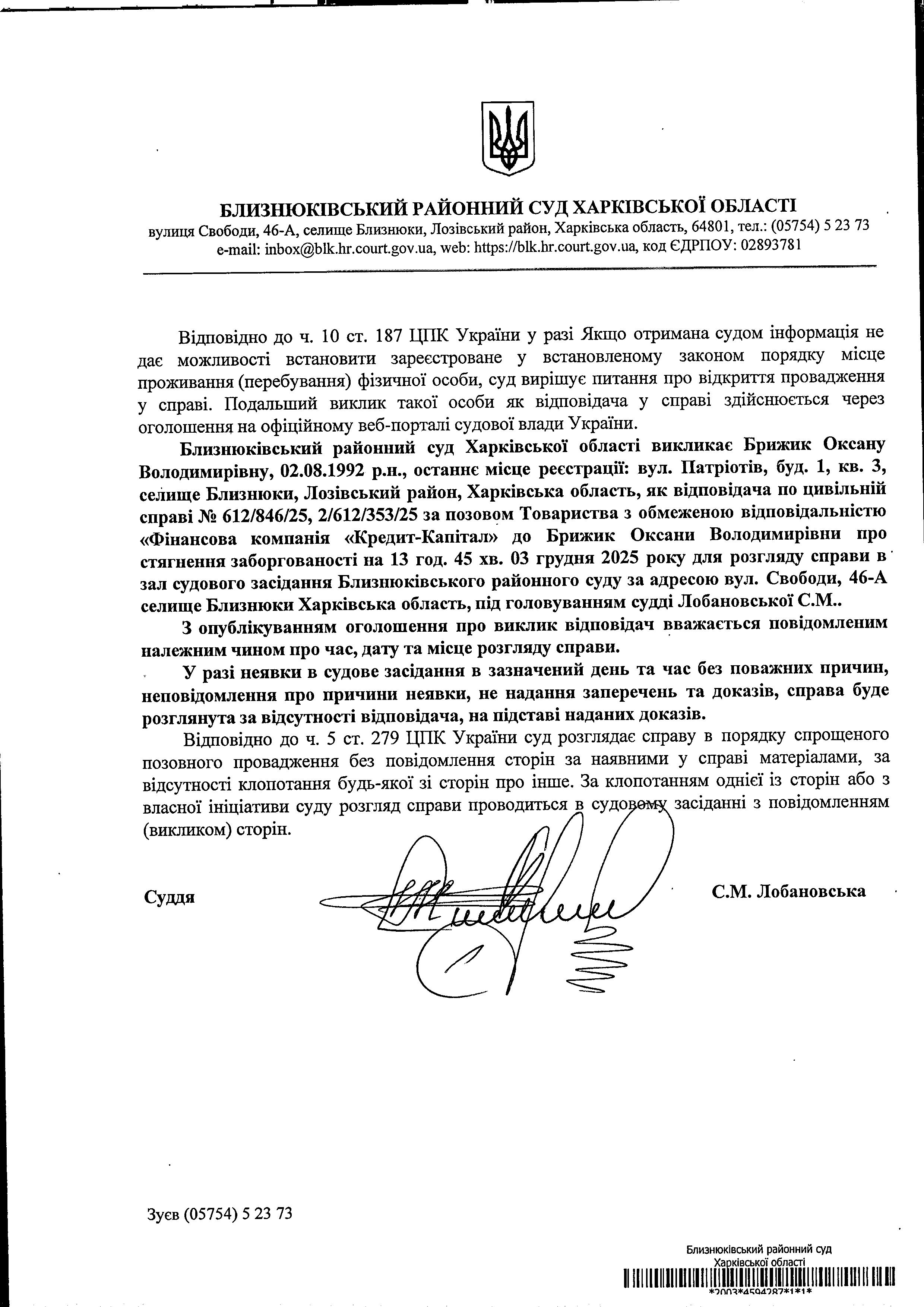 Оголошення про виклик до суду Брижик Оксану Володимирівнуна 13 год. 45 хв. 03 грудня 2025 року по справі № 612/846/25 суддя Лобановська С.М.