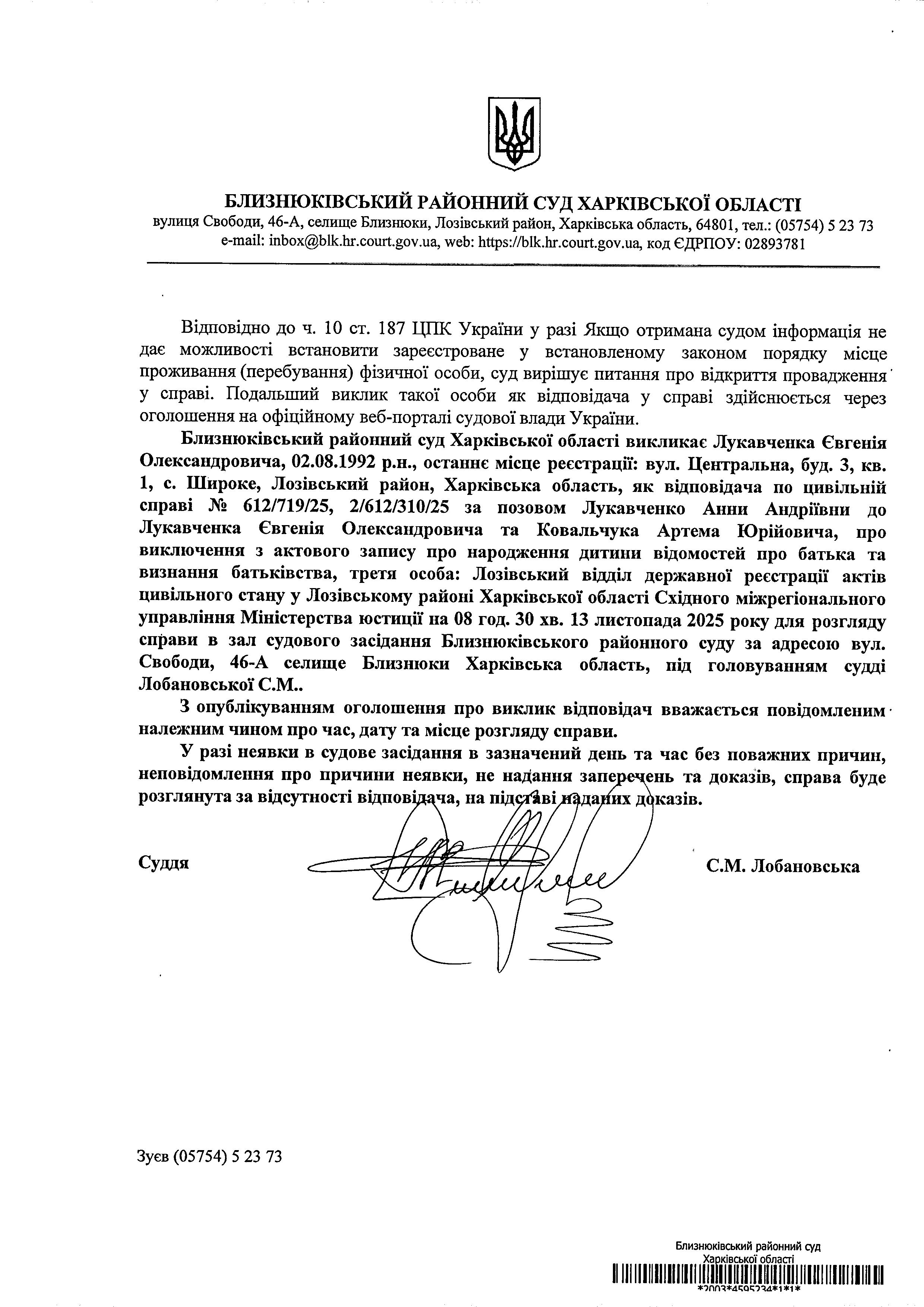 Оголошення про виклик до суду Лукавченка Євгенія Олександровича 08 год. 30хв. 13 грудня 2025 року по справі № 612/719/25 суддя Лобановська С.М.
