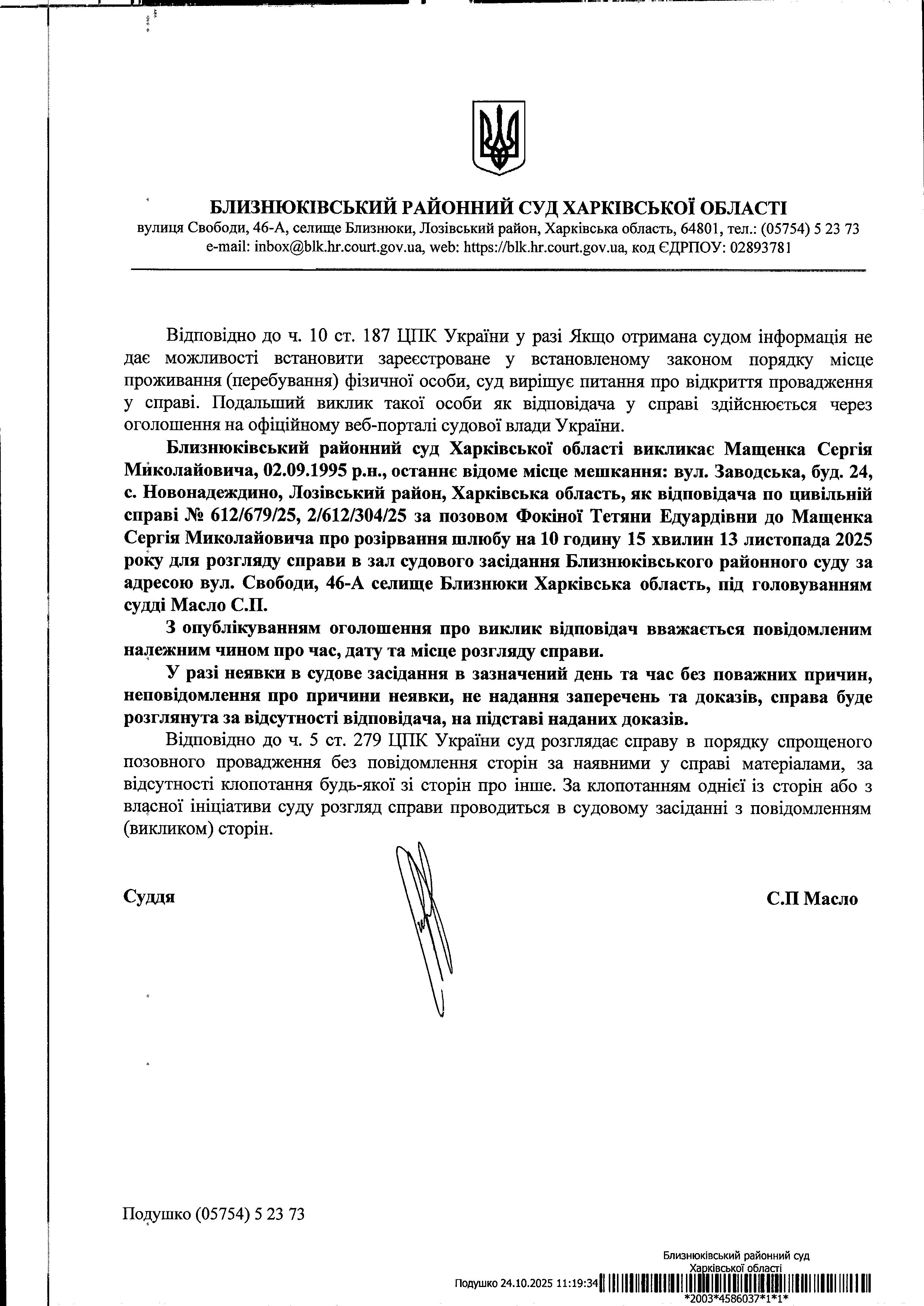 Оголошення про виклик до суду Мащенко Сергія Миколайовича на 10год. 15хв. 13 листопада 2025 року по справі № 612/679/25 суддя Масло С.П.