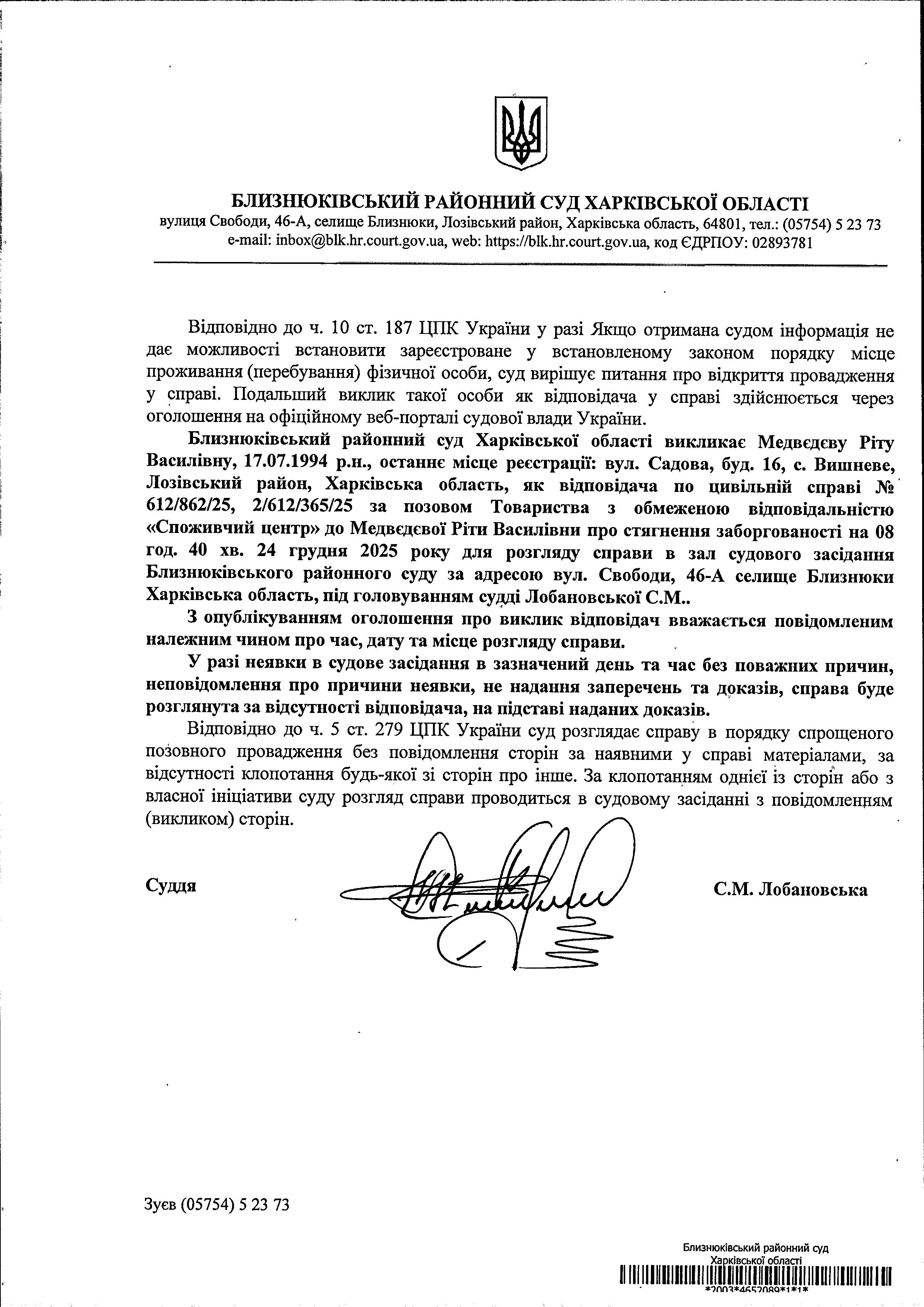 Оголошення про виклик до суду Мєдвєдєву Ріту Василівну 08 год. 40хв. 24 грудня 2025 року по справі № 612/862/25 суддя Лобановська С.М.