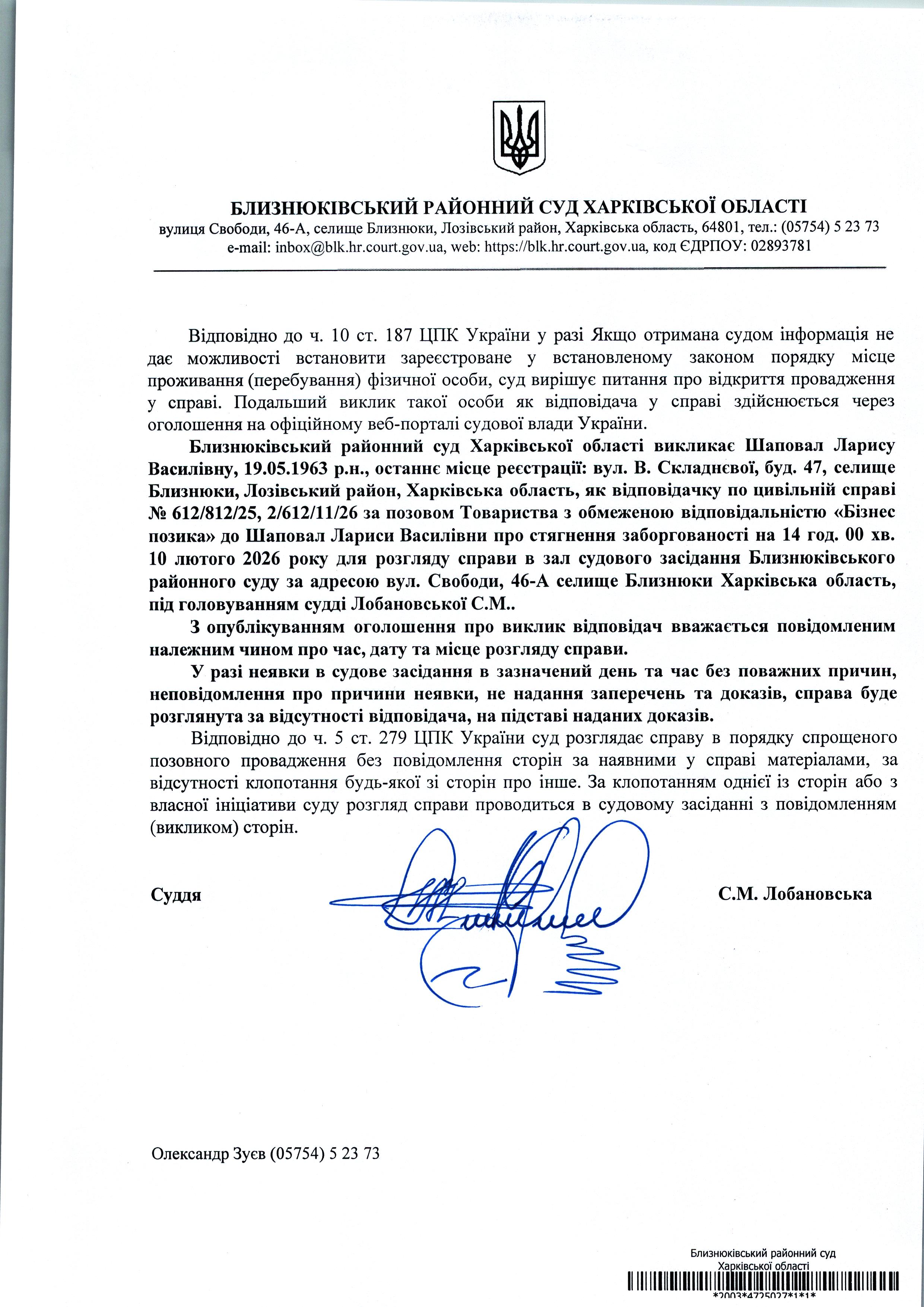 Оголошення про виклик до суду Шаповал Ларису Василівну 14 год. 00хв. 10 лютого 2026 року по справі № 612/812/25 суддя Лобановська С.М.
