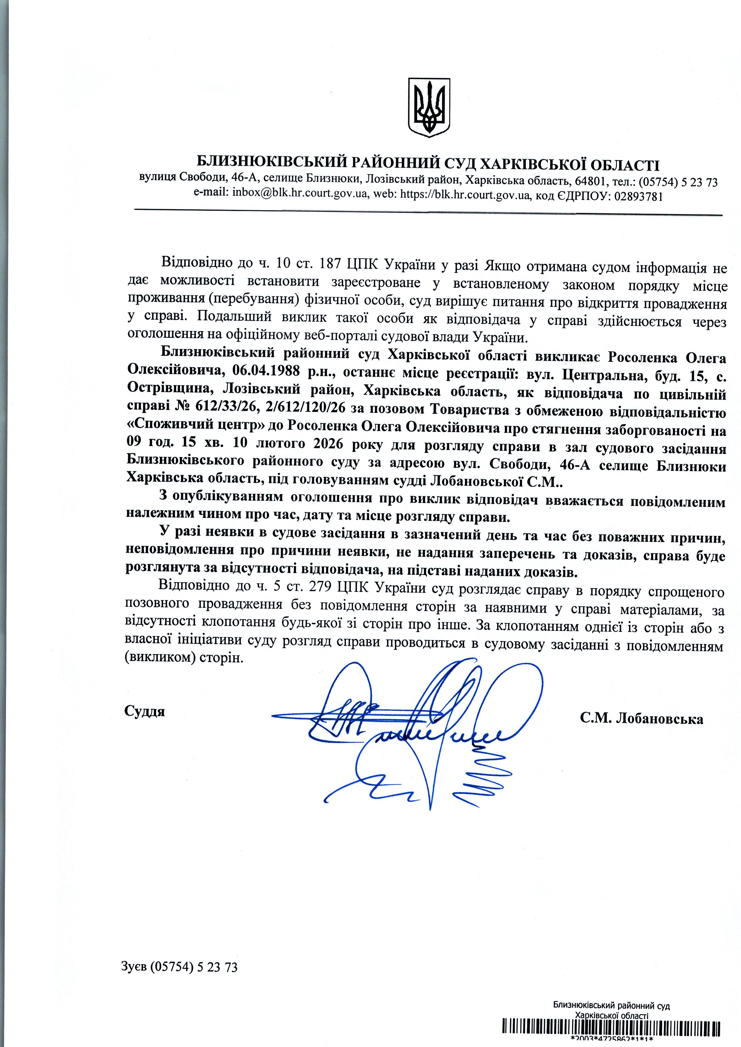 Оголошення про виклик до суду Росоленка Олега Олексійовича 09 год. 15хв. 10 лютого 2026 року по справі № 612/33/26 суддя Лобановська С.М.