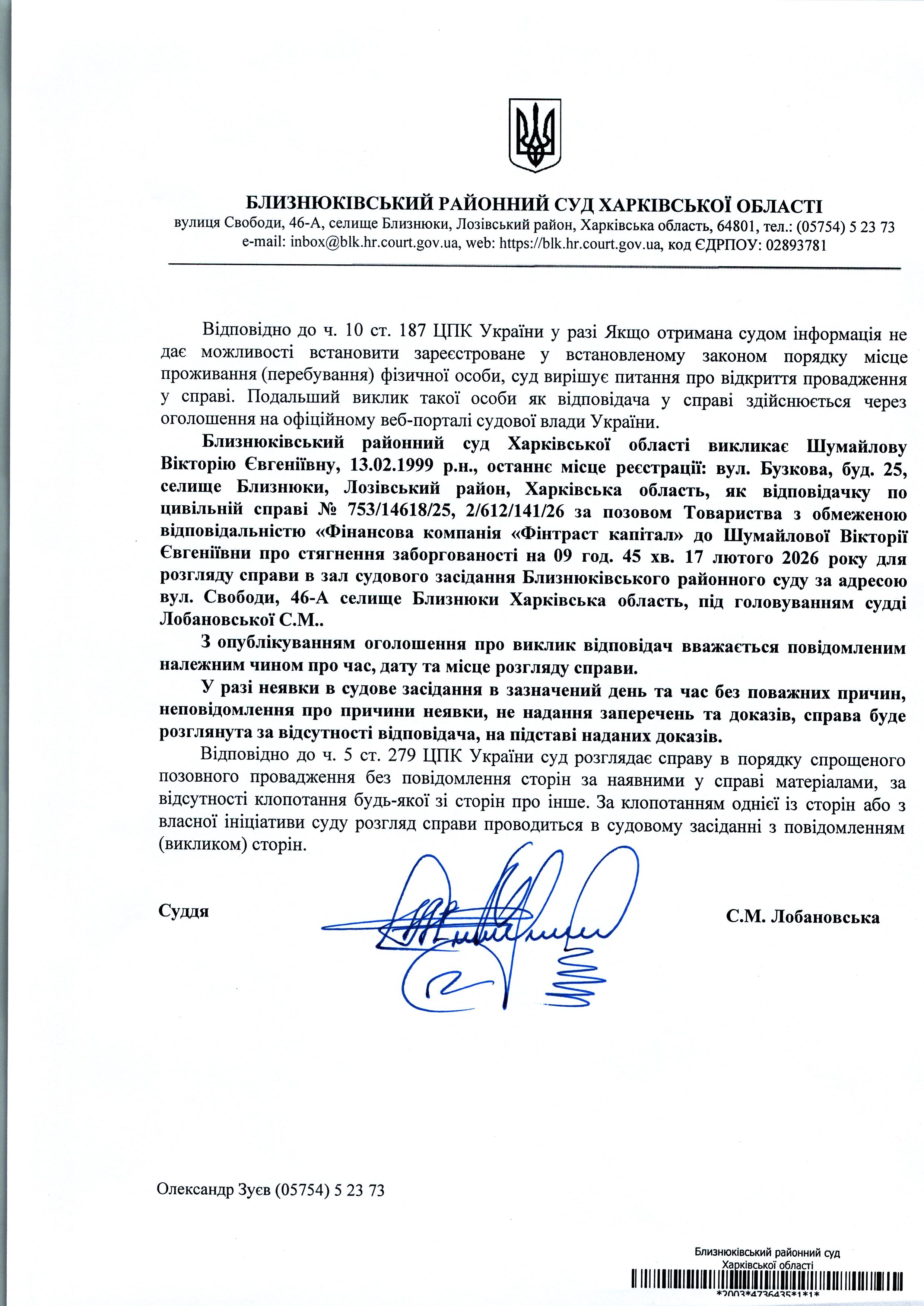 Оголошення про виклик до суду Шумайлову Вікторію Євгеніївну 09 год. 45хв. 17 лютого 2026 року по справі № 753/14618/25 суддя Лобановська С.М.