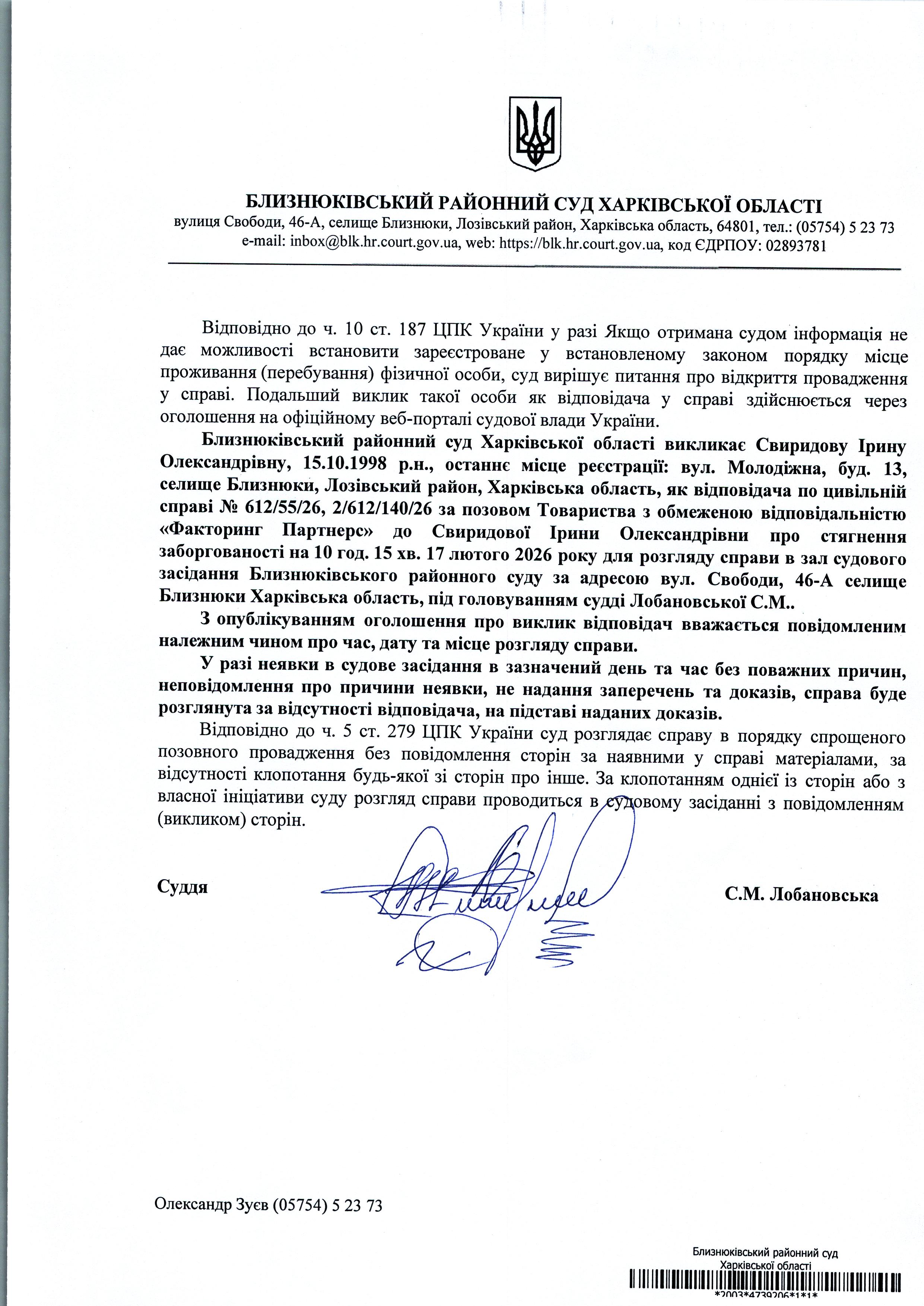 Оголошення про виклик до суду Свиридову Ірину Олександрівну 10 год. 15хв. 17 лютого 2026 року по справі № 612/55/26 суддя Лобановська С.М.