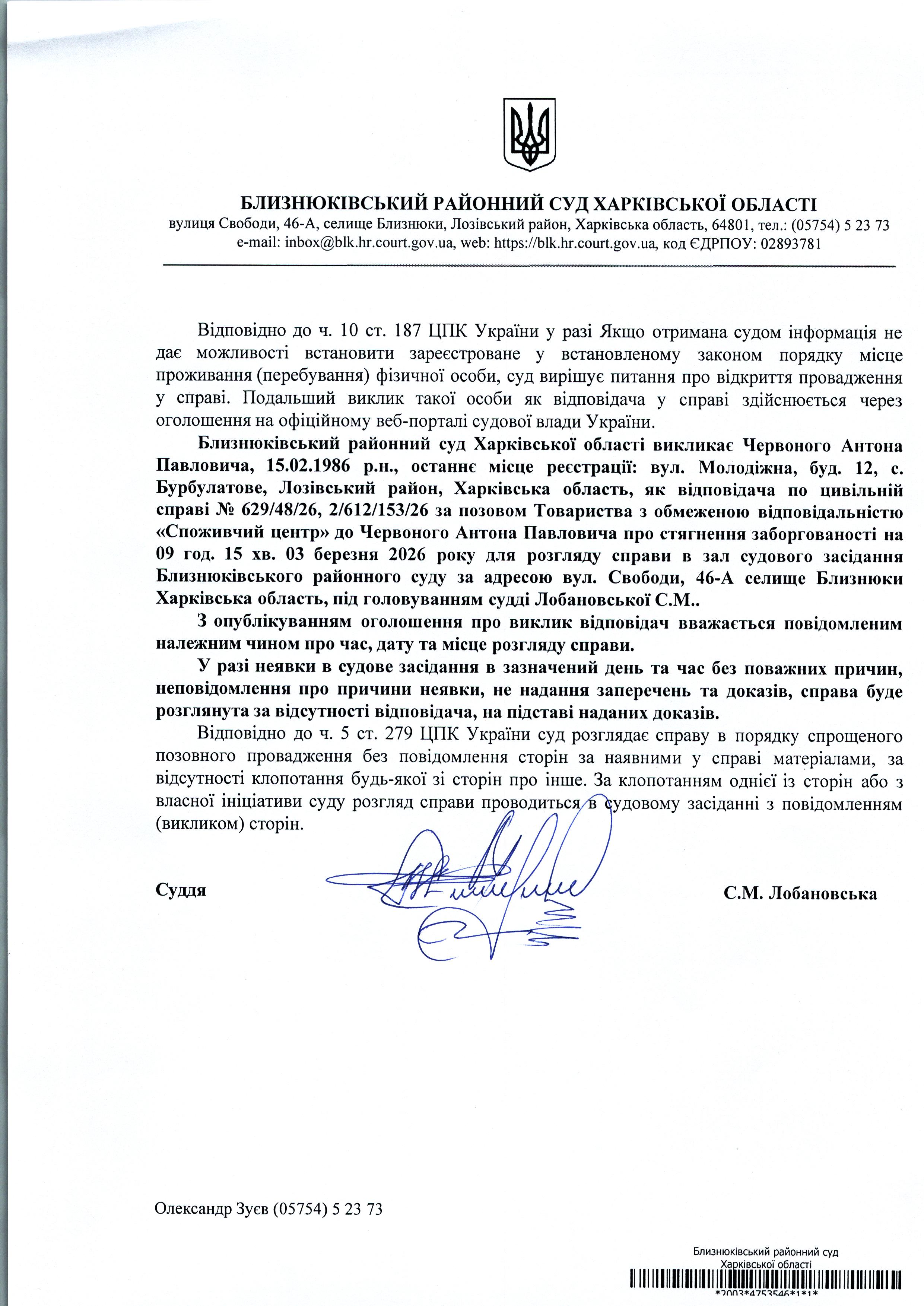 Оголошення про виклик до суду Червоного Антона Павловича 09 год. 15хв. 03 березня 2026 року по справі № 629/48/26 суддя Лобановська С.М.