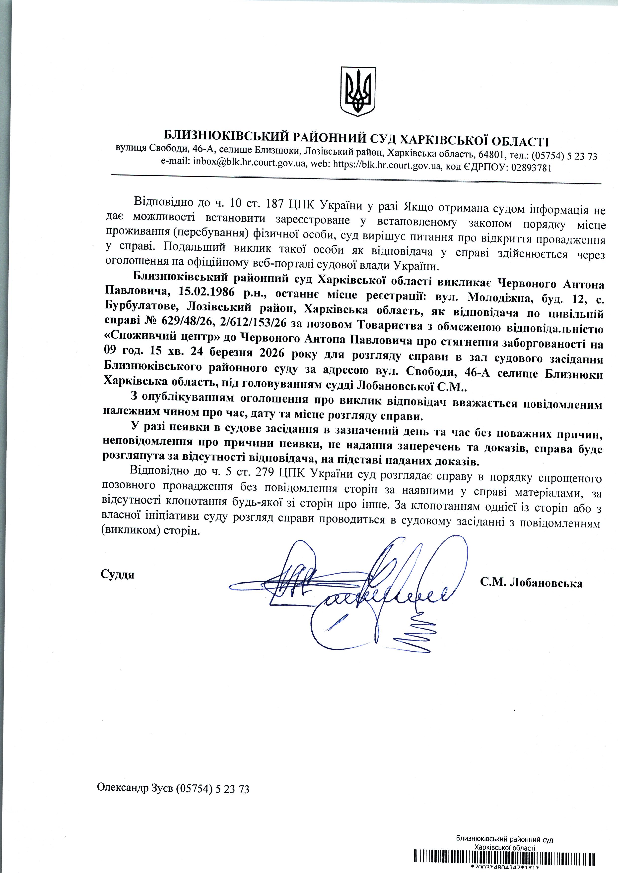 Оголошення про виклик до суду Червоного Антона Павловича 09 год. 15хв. 24 березня 2026 року по справі № 629/48/26 суддя Лобановська С.М.