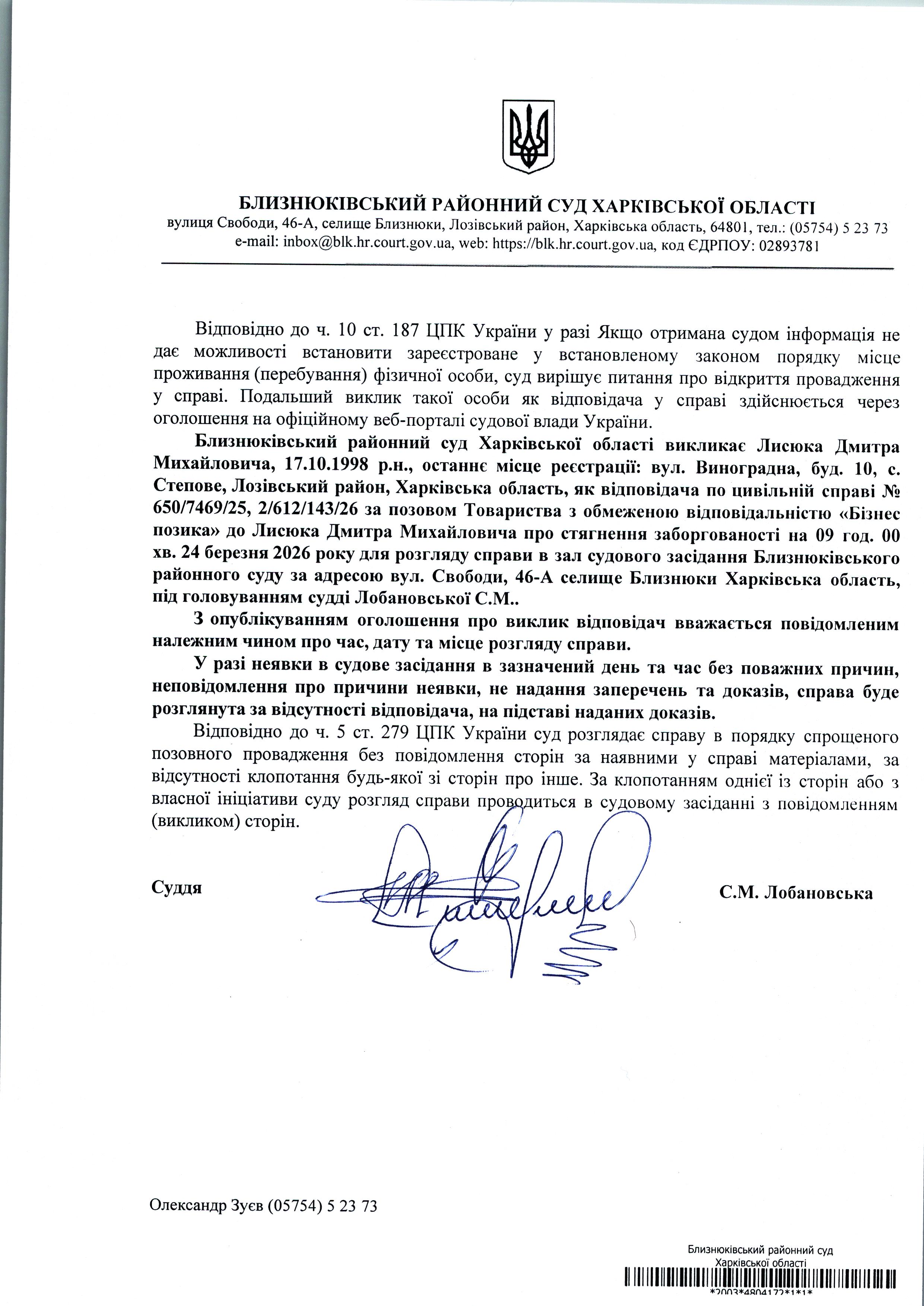 Оголошення про виклик до суду Лмсюка Дмитра Михайловича 09 год. 00хв. 24 березня 2026 року по справі № 650/7469/25 суддя Лобановська С.М.