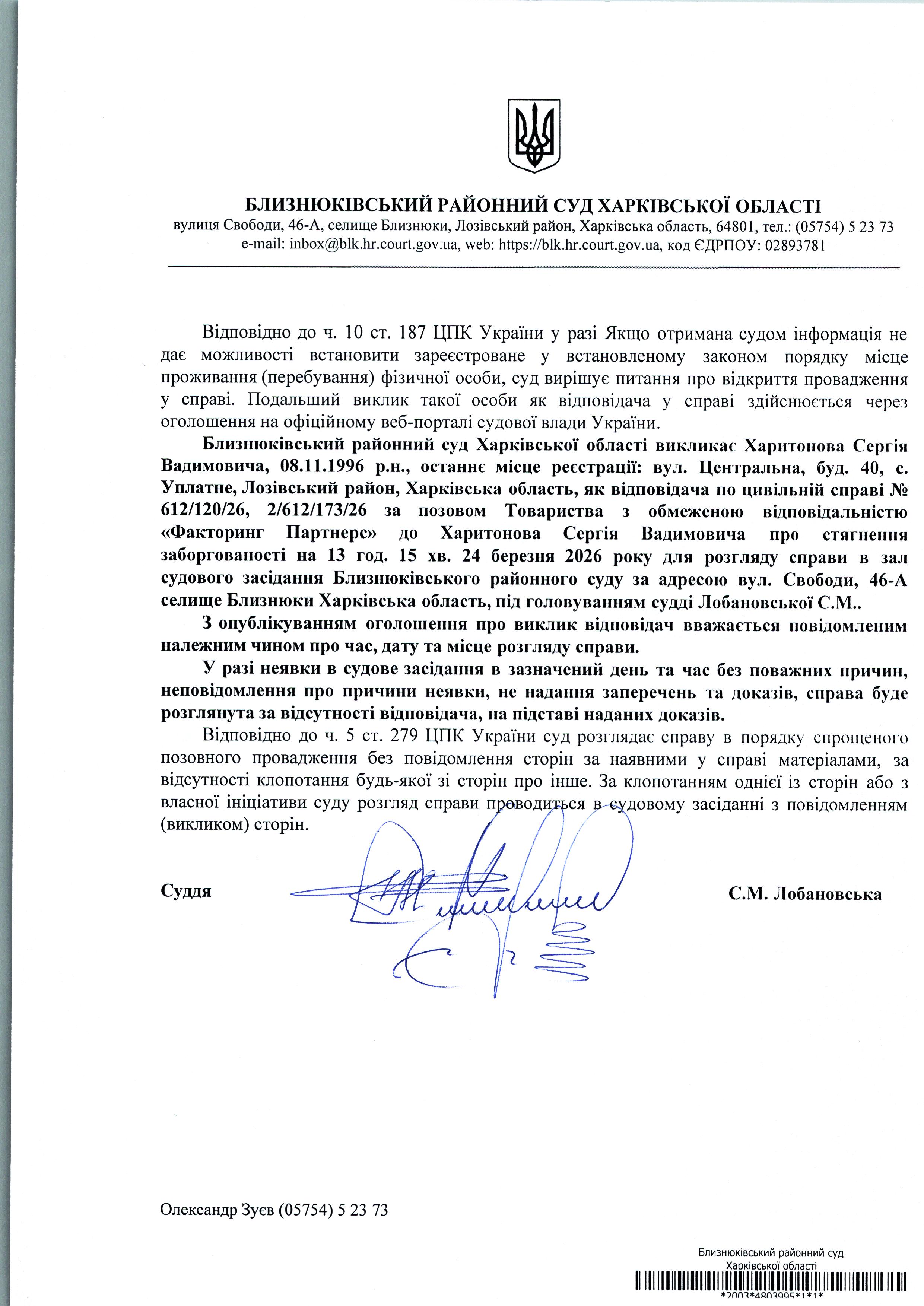 Оголошення про виклик до суду Харитонова Сергія Вадимовича 13 год. 15хв. 24 березня 2026 року по справі № 612/120/26 суддя Лобановська С.М.