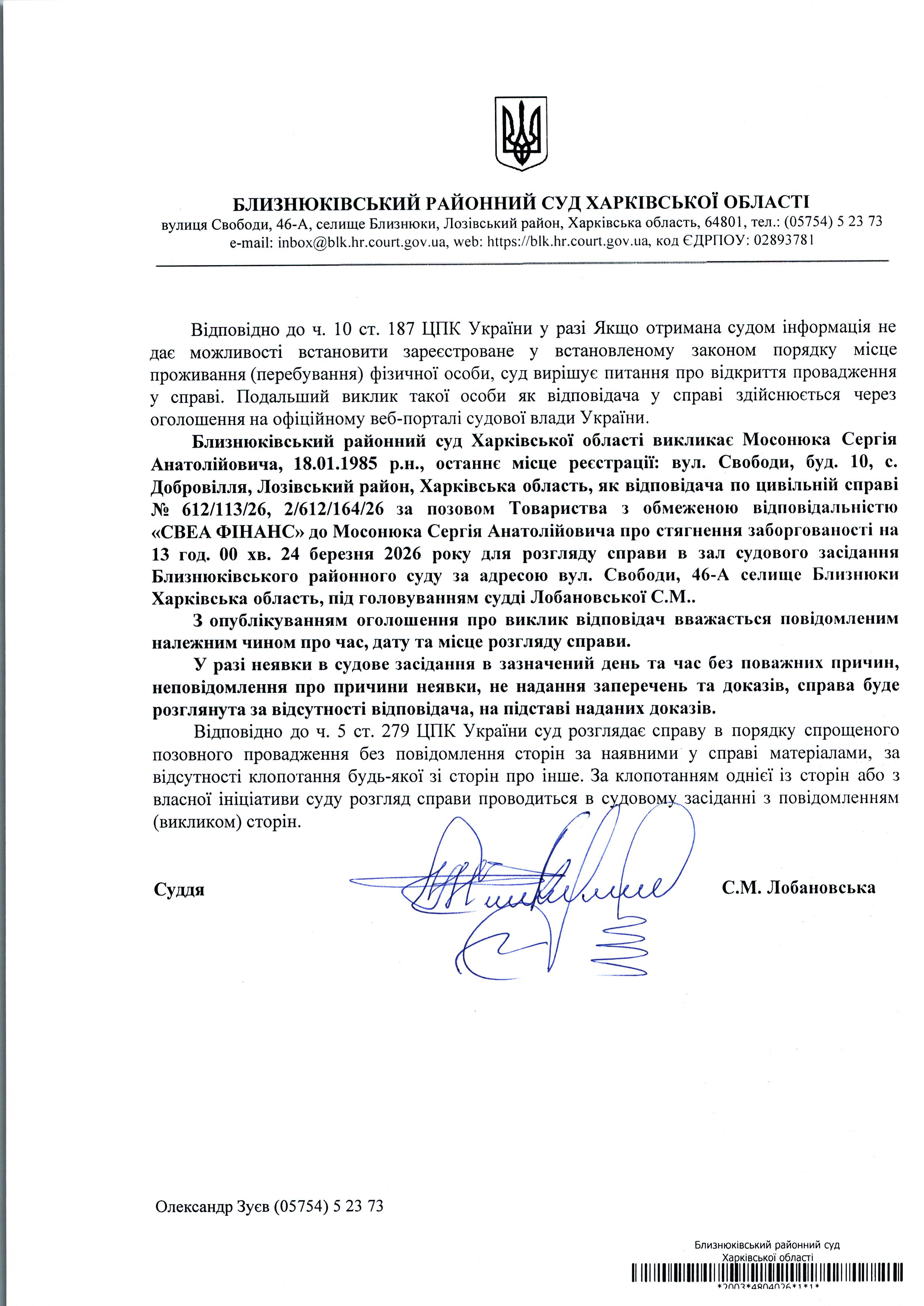 Оголошення про виклик до суду Мосонюка Сергія Анатолійовича 13 год. 00хв. 24 березня 2026 року по справі № 612/113/26 суддя Лобановська С.М.