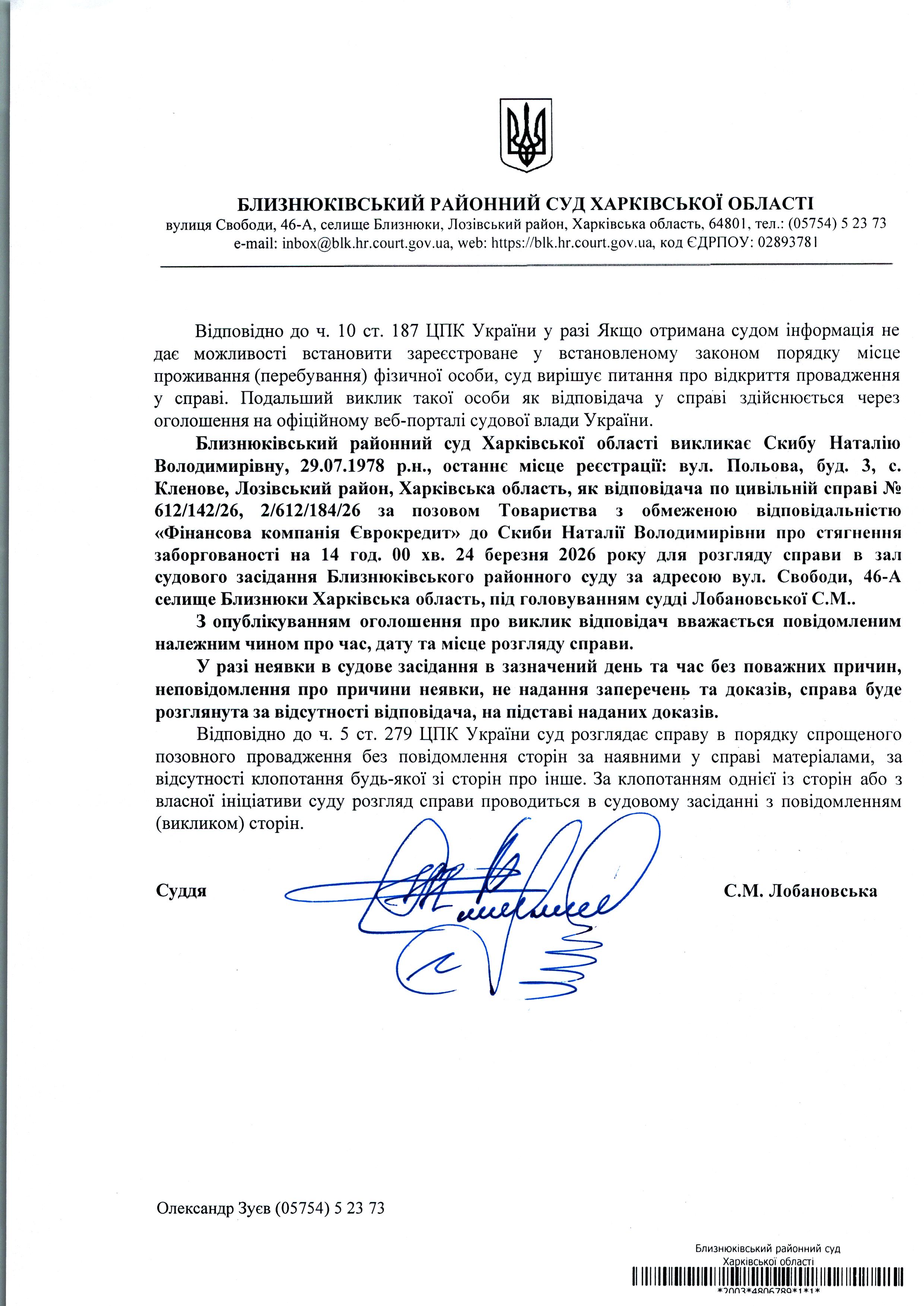Оголошення про виклик до суду Скибу Наталію Володимирівну 14 год. 00хв. 24 березня 2026 року по справі № 612/142/26 суддя Лобановська С.М.