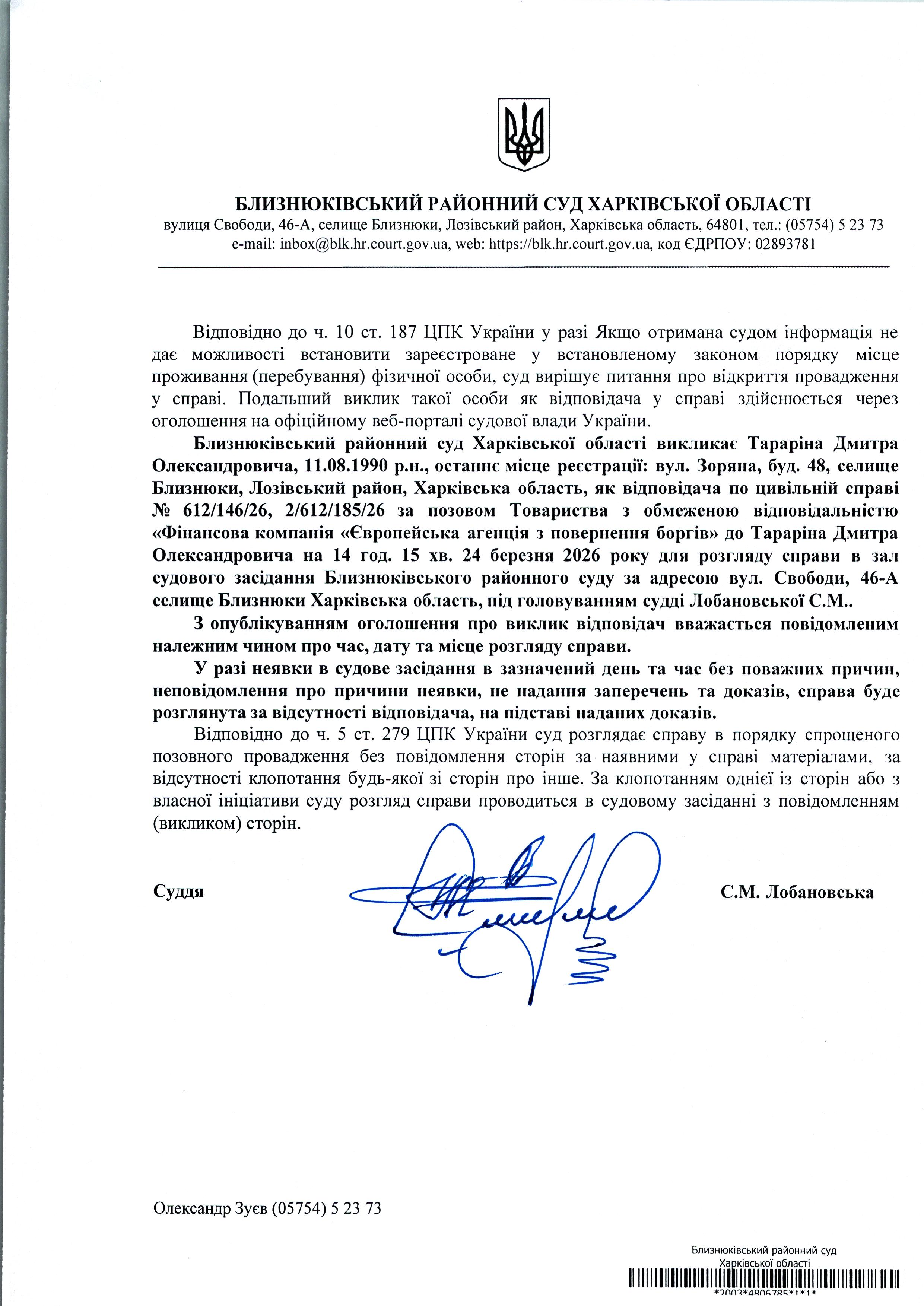 Оголошення про виклик до суду Тараріна Дмитра Олександровича 14 год. 15хв. 24 березня 2026 року по справі № 612/146/26 суддя Лобановська С.М.