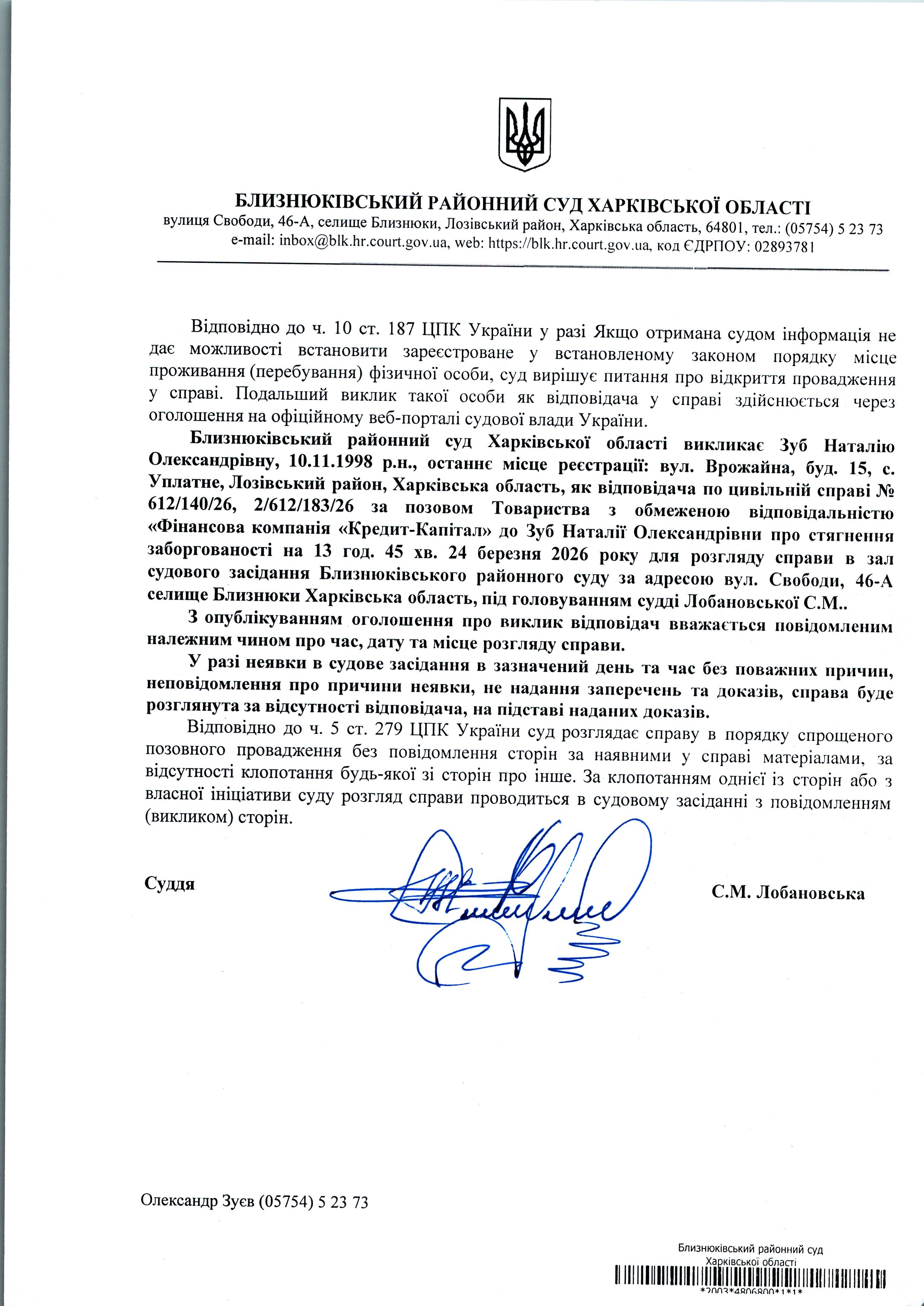 Оголошення про виклик до суду Зуб Наталію Олександрівну 14 год. 45хв. 24 березня 2026 року по справі № 612/140/26 суддя Лобановська С.М.