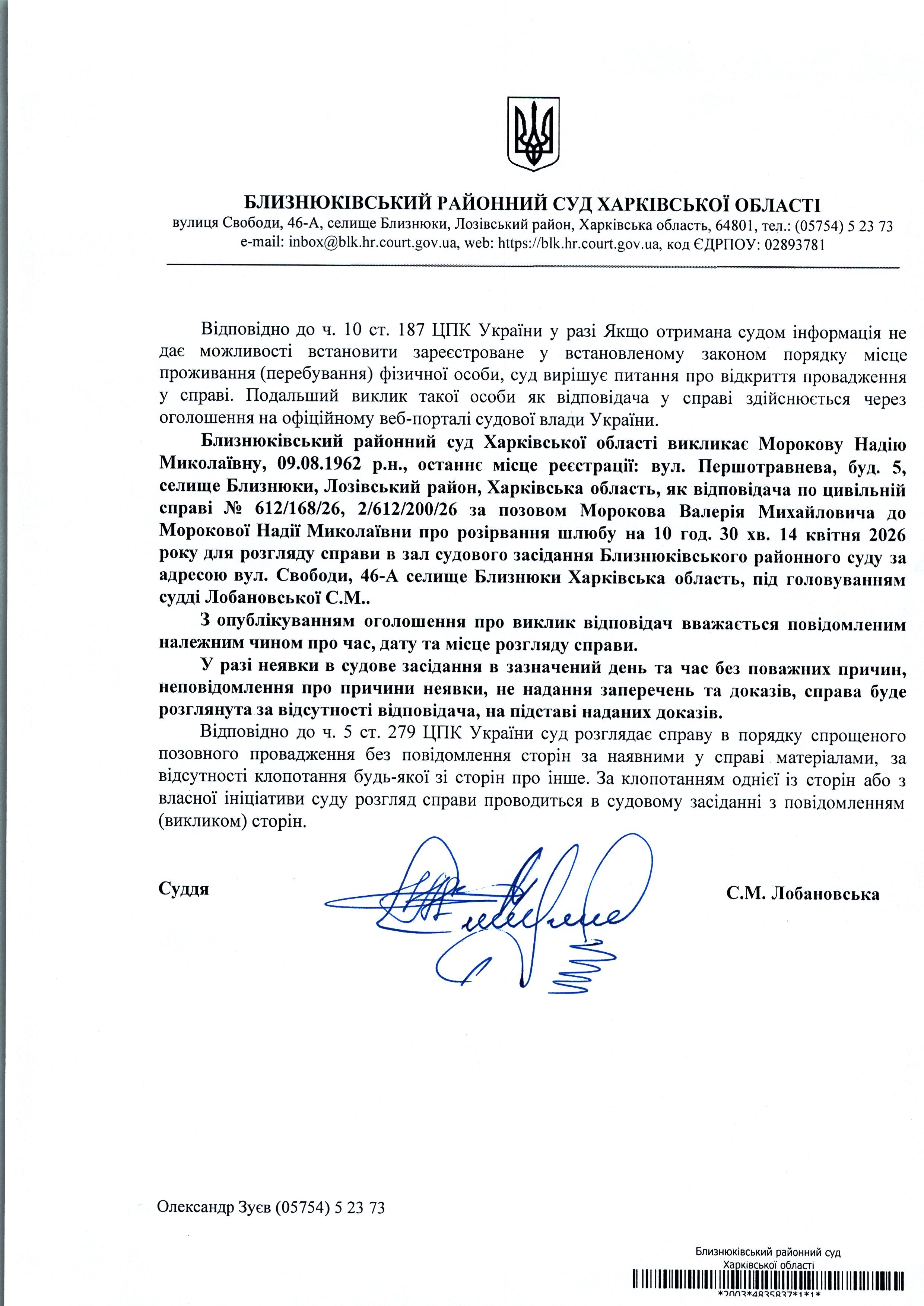 Оголошення про виклик до суду Морокову Надію Миколаївну 10 год. 30хв. 14 квітня 2026 року по справі №612/168/26 суддя Лобановська С.М.
