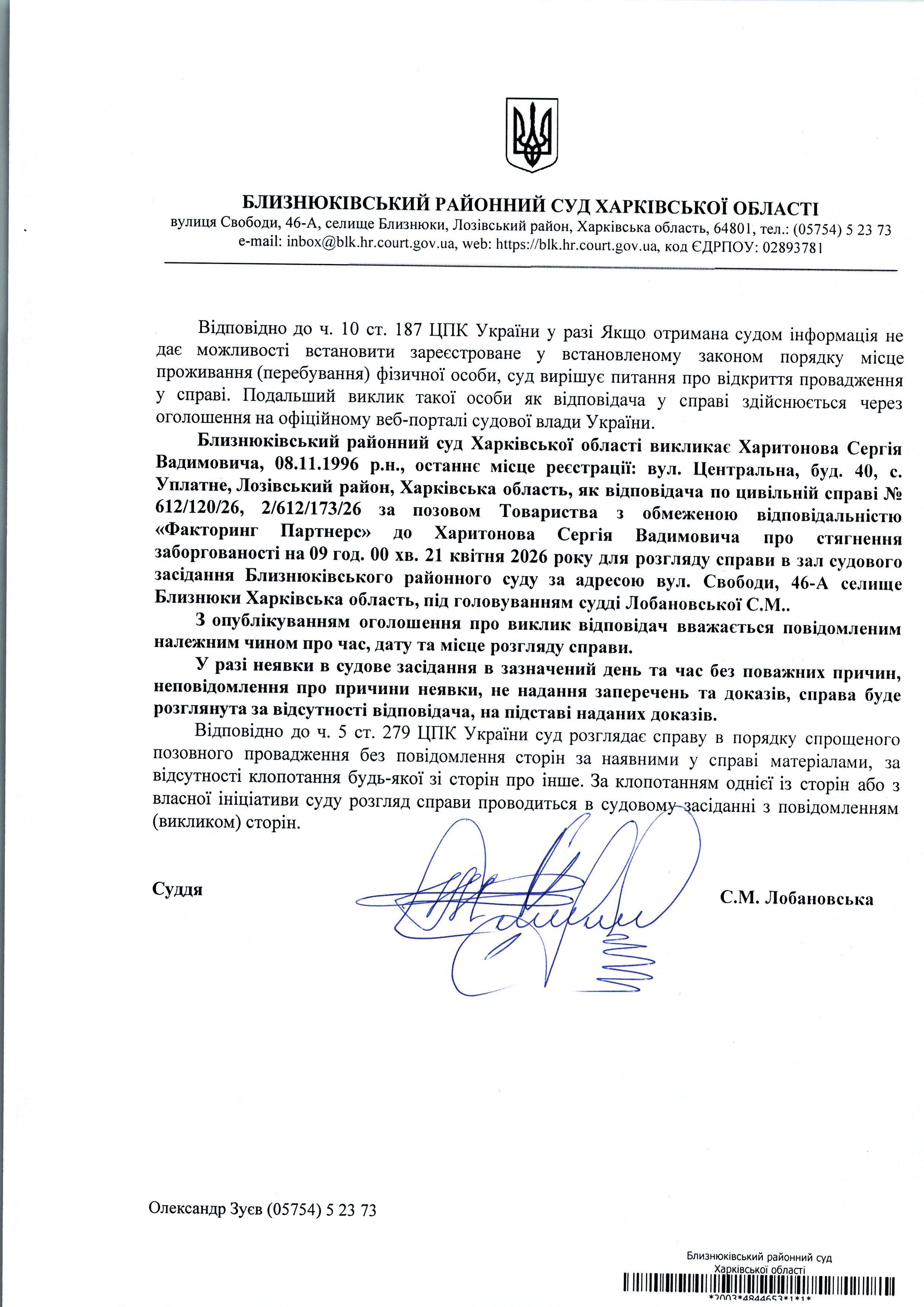 Оголошення про виклик до суду Харитонова Сергія Вадимовича 09 год. 00хв. 21 квітня 2026 року по справі №612/120/26 суддя Лобановська С.М.