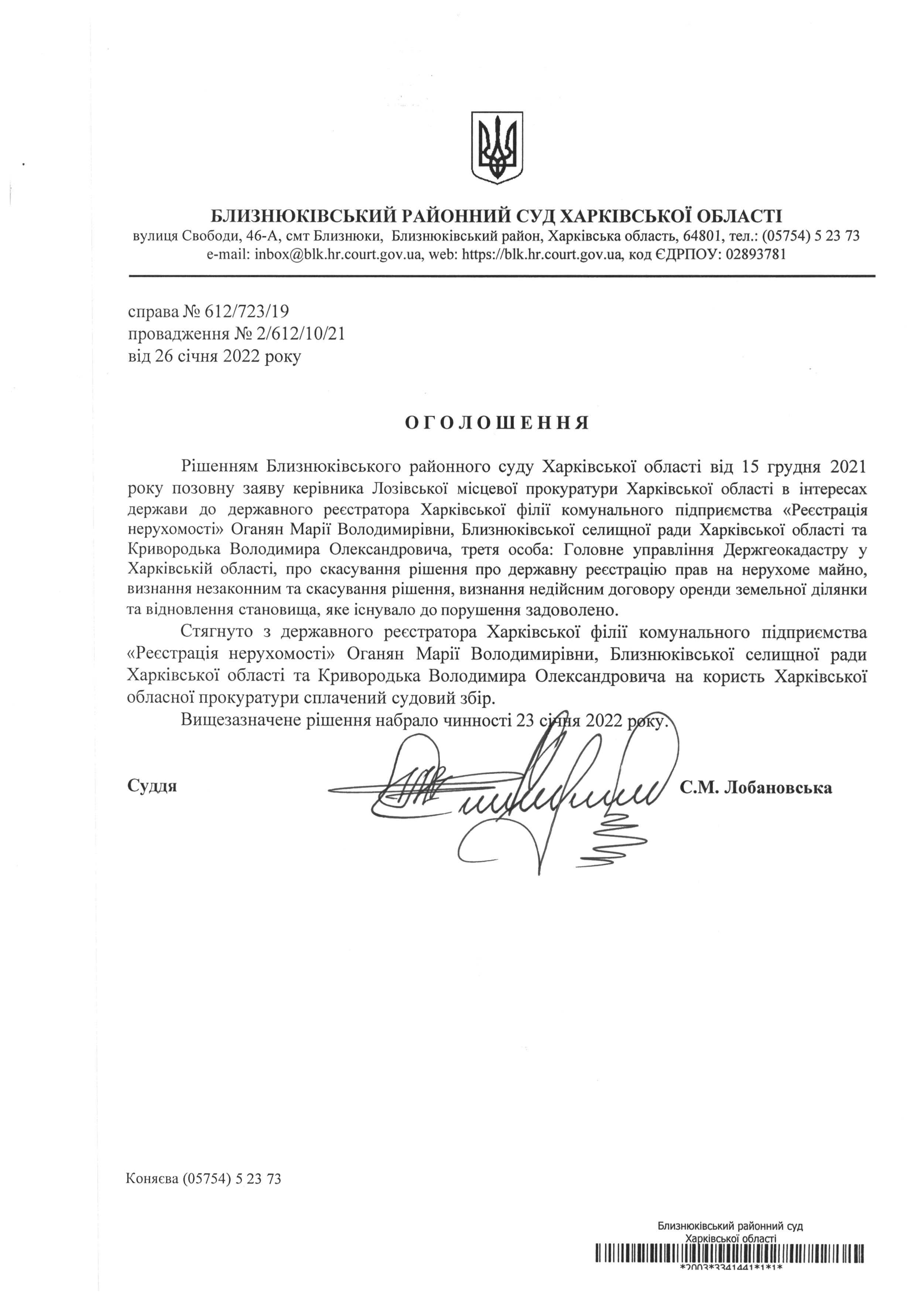 Оголошення про набрання законної сили рішення від 15.12.2021 за позовом керівника Лозівської місцевої прокуратури Харківської області в інтересах держави до державного реєстратора Харківської філії комунального підприємства «Реєстрація нерухомості» Оганян