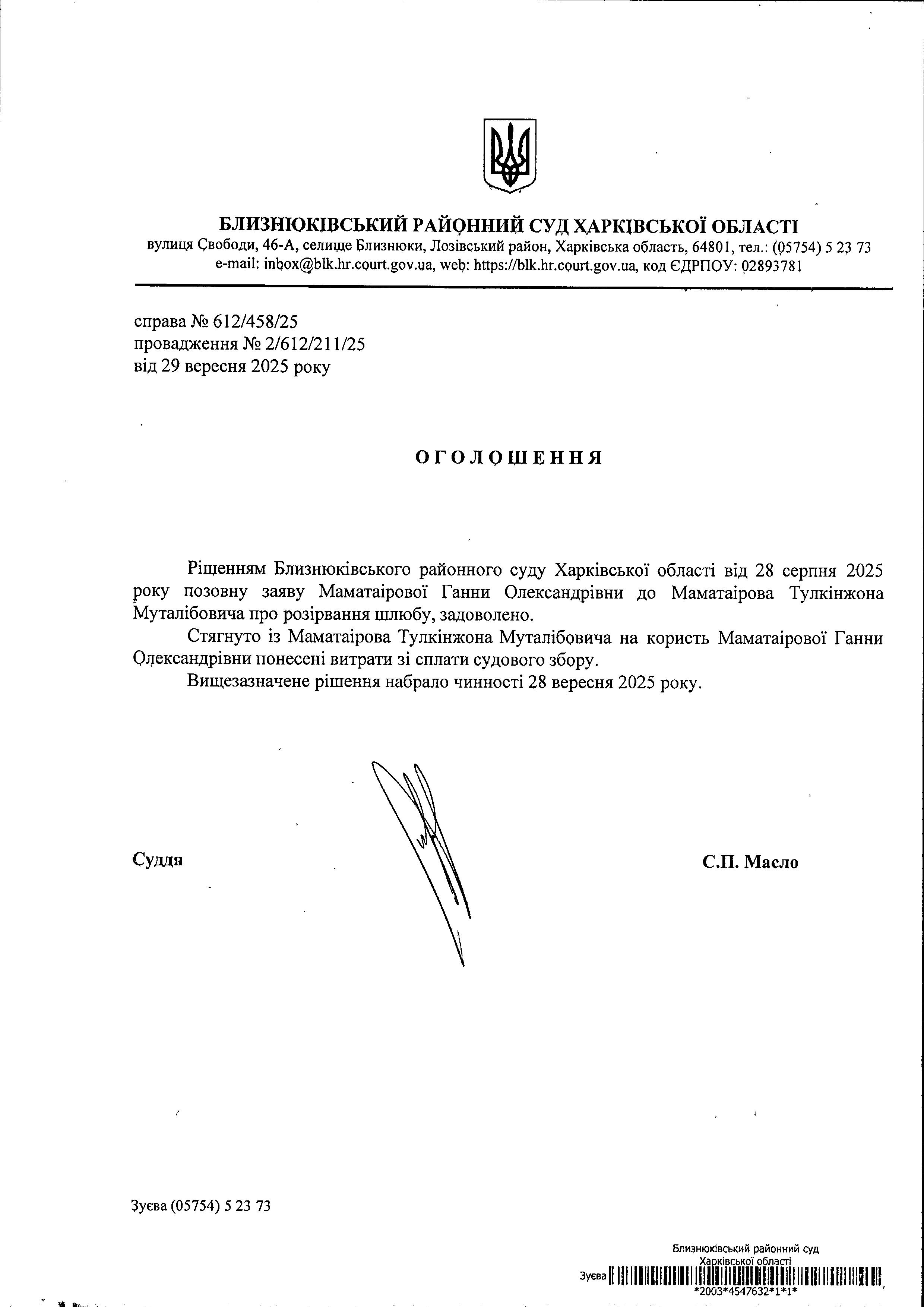 Оголошення про набрання чинності рішення суду від 28.08.2025 за позовом Маматаірова Г.О. до Маматаірова Т.М. про розірвання шлюбу