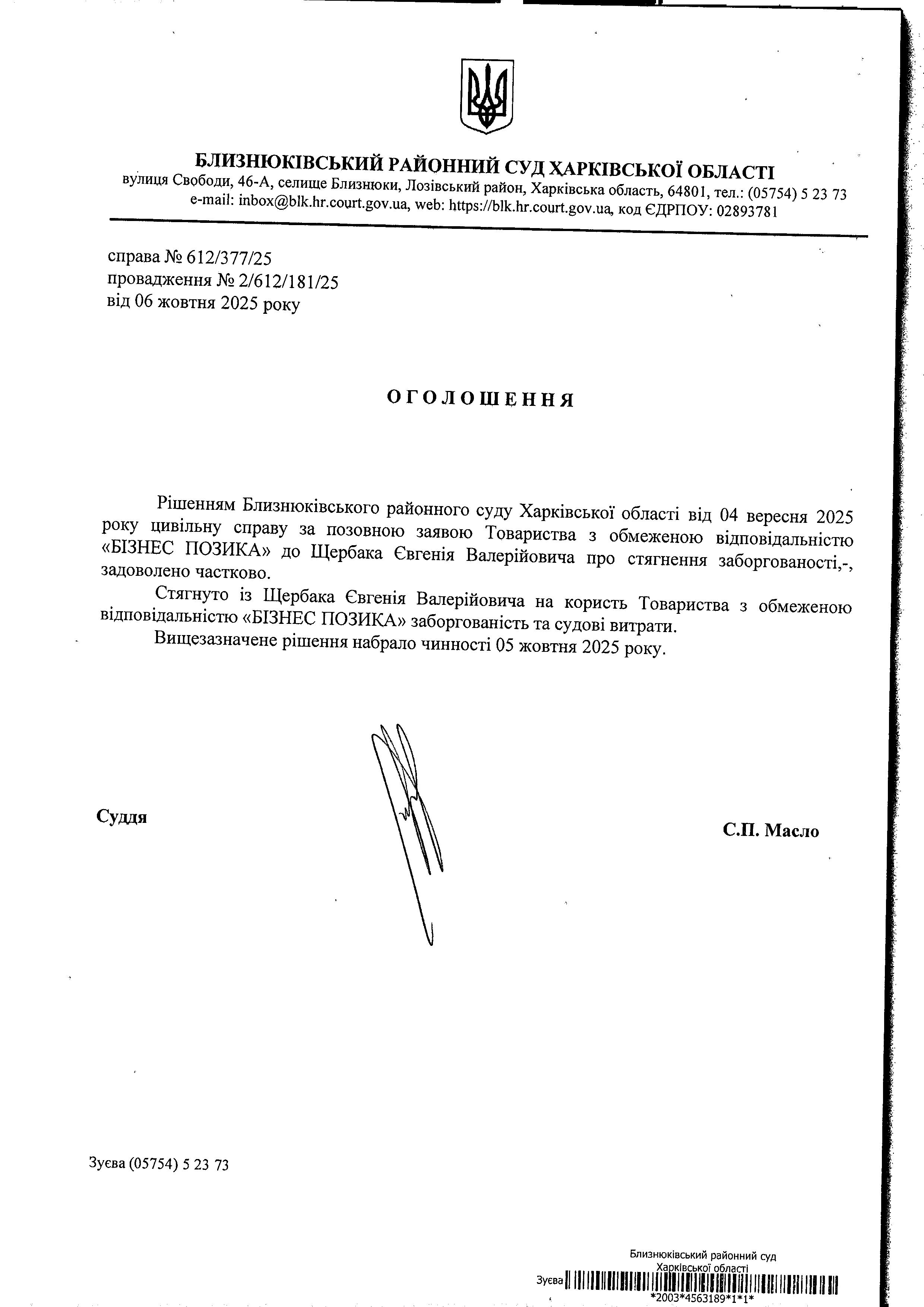 Оголошення про набрання чинності рішення суду від 04 вересня 2025 року за позовом ТОВ "БІЗНЕС ПОЗИКА" до Щербака Євгенія Валерійовича про стягнення заборгованості