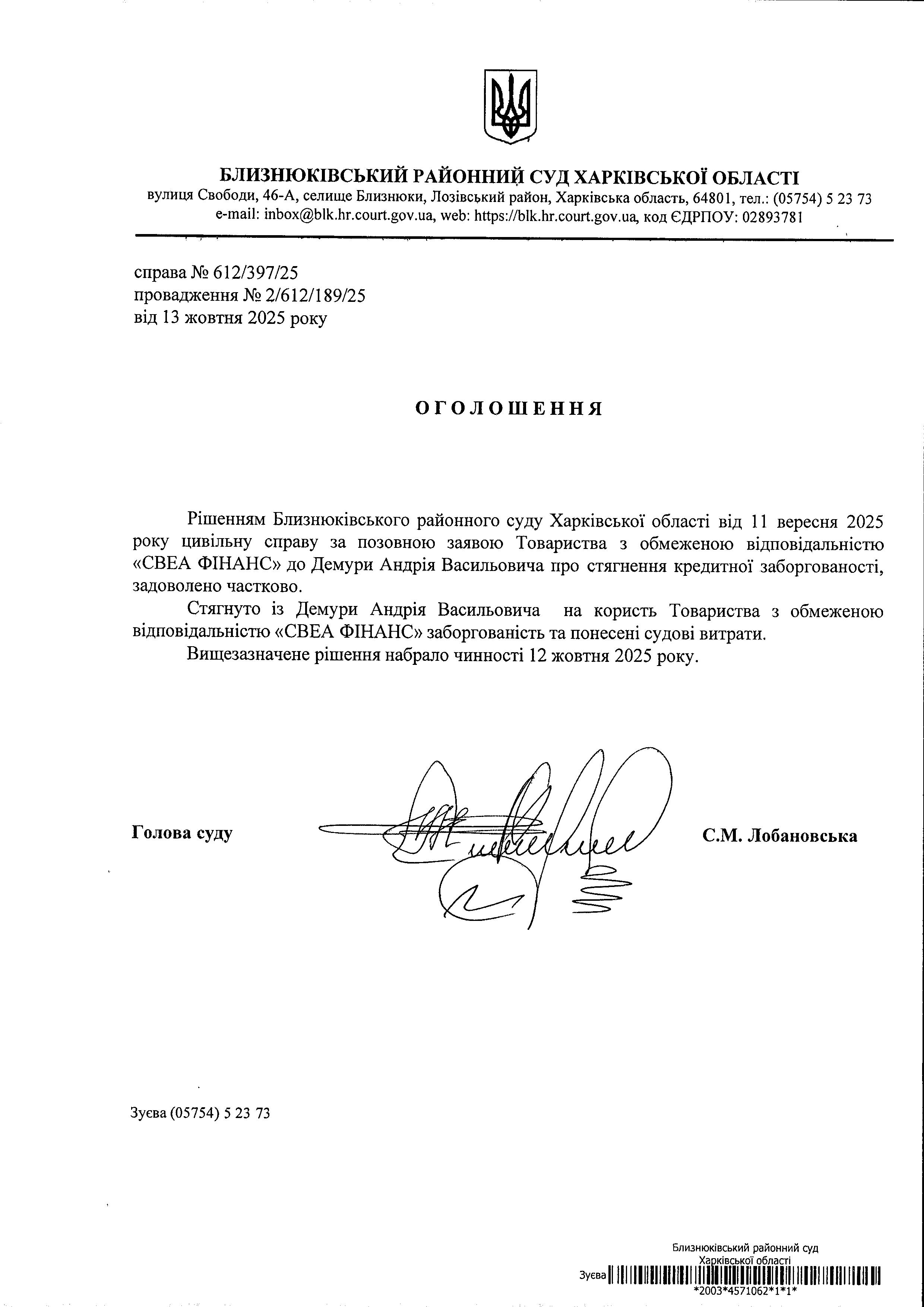 Оголошення про набрання чинності рішення суду від 11 вересня 2025 року за позовом ТОВ "СВЕА ФІНАНС" до Демури Андрія Васильовича про стягнення заборгованості