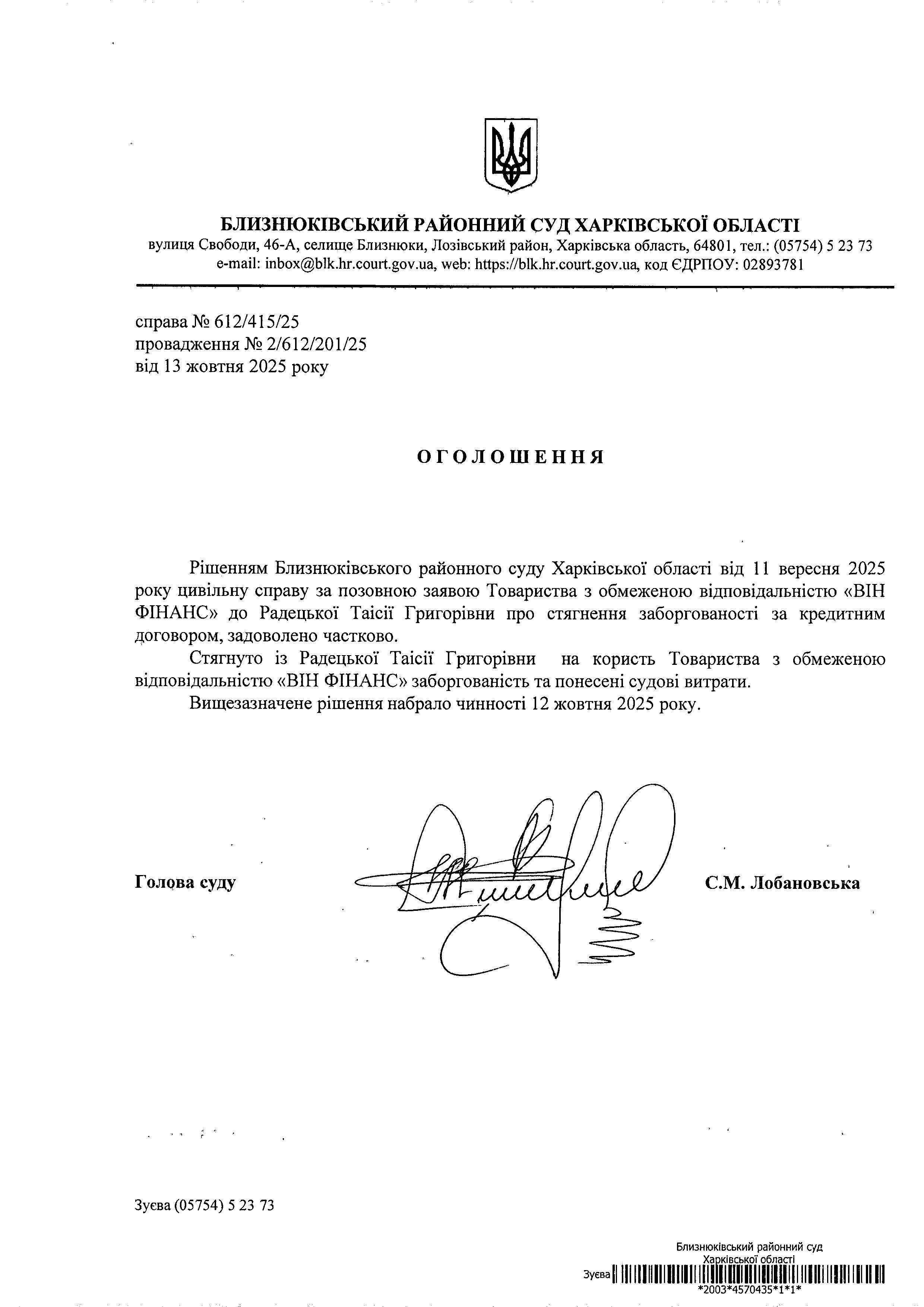Оголошення про набрання чинності рішення суду від 11 вересня 2025 року за позовом ТОВ "ВІН ФІНАНС" до Радецької Таісії Григорівни про стягнення заборгованості