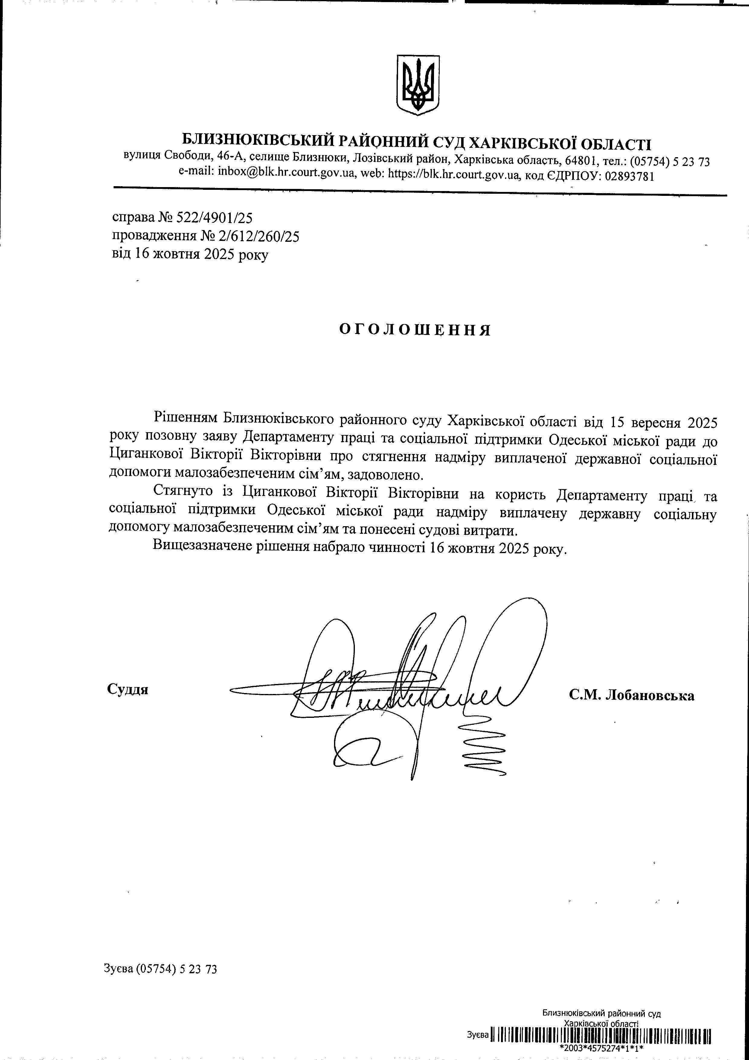 Оголошення про набрання чинності рішення суду від 15 вересня 2025 року за позовом Департаменту праці та соціальної підтримки Одеської міської ради до Циганкової Вікторії Вікторівни про стягнення надміру виплаченої державної соціальної допомоги малозабезпе