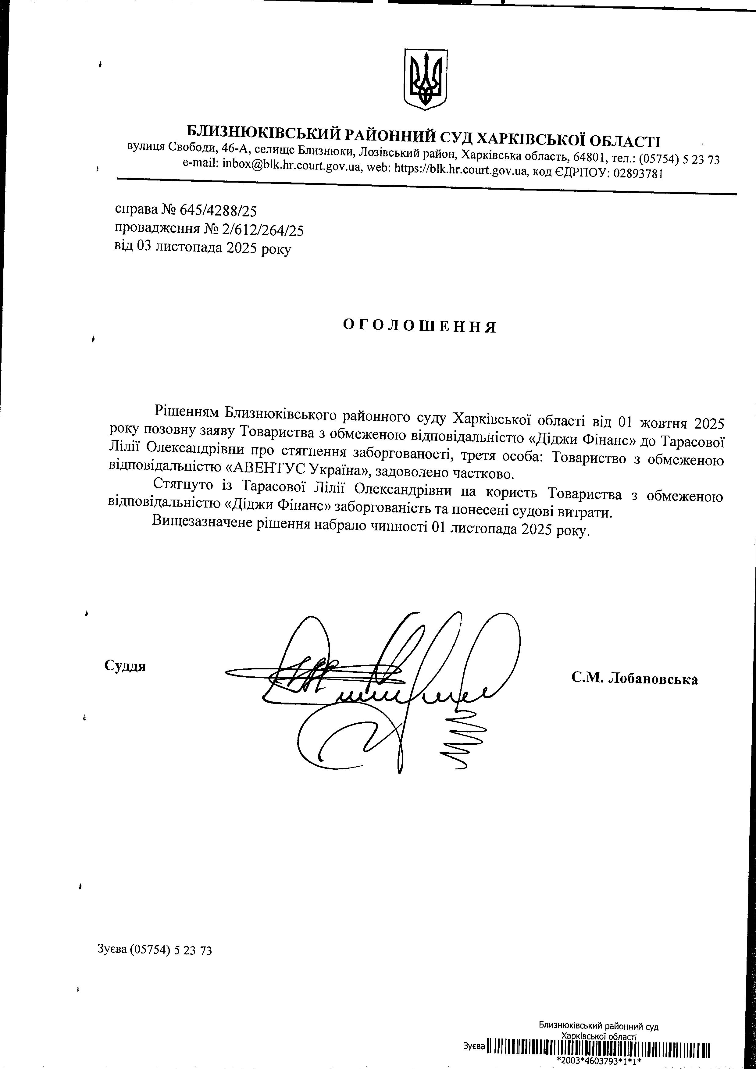 Оголошення про набрання чинності рішення суду від 01 жовтня 2025 року за позовом ТОВ "Діджи Фінанс" до Тарасової Лілії Олександрівни про стягнення заборгованості