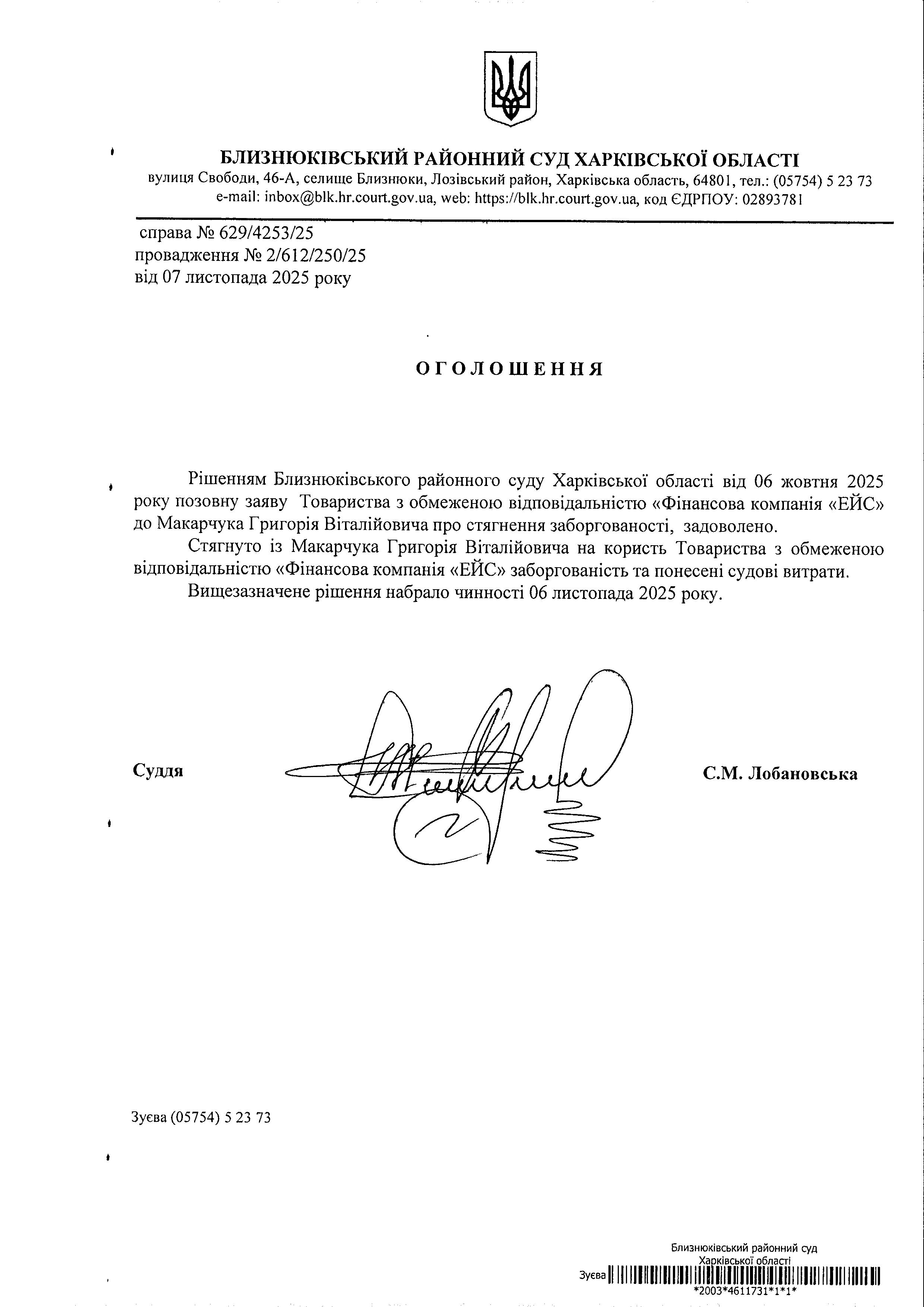 Оголошення про набрання чинності рішення суду від 06 жовтня 2025 року за позовом ТОВ "Фінансова Компанія "ЕЙС"" до Макарчука Григорія Віталійовича про стягнення заборгованості