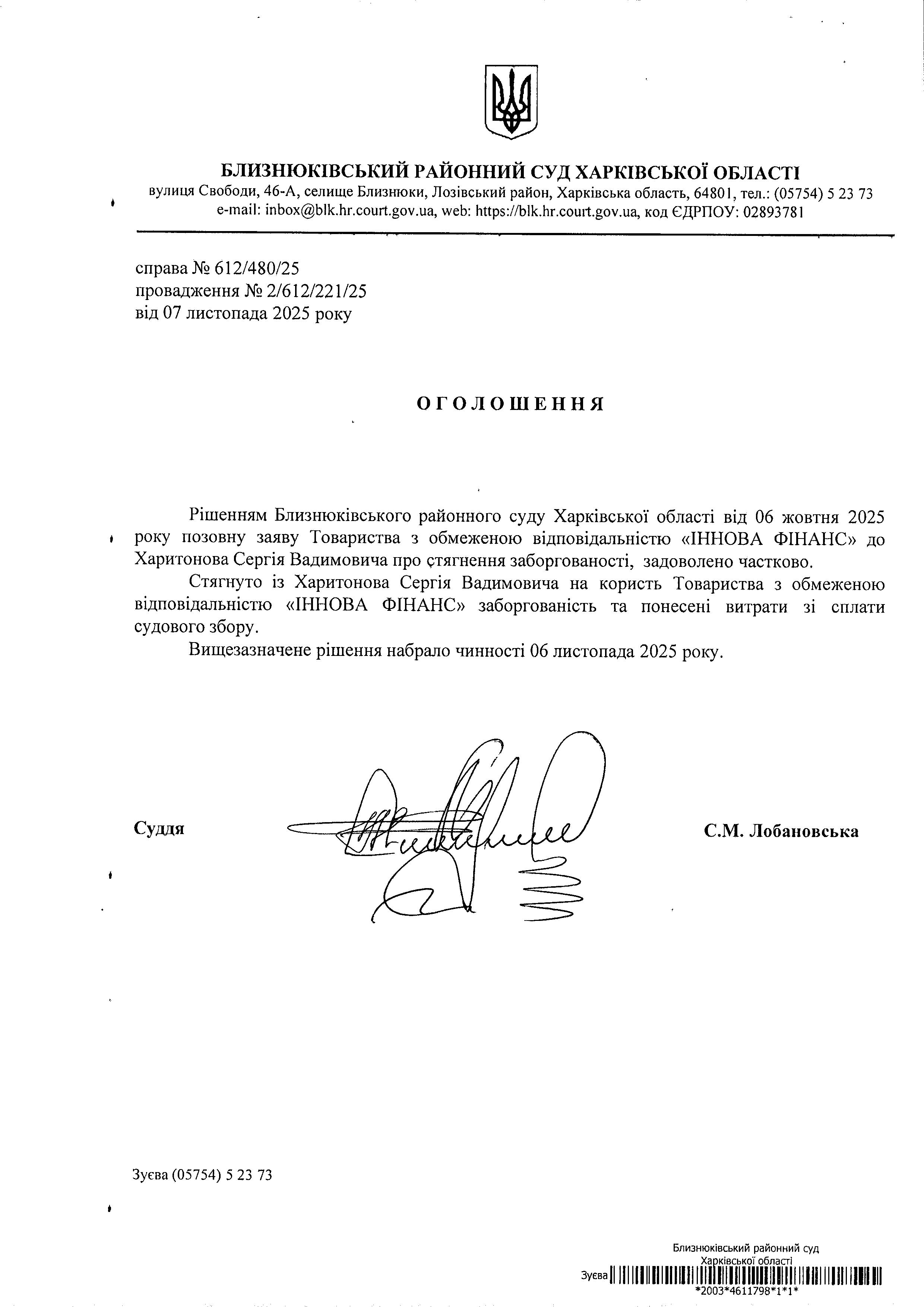 Оголошення про набрання чинності рішення суду від 06 жовтня 2025 року за позовом ТОВ "ІННОВА ФІНАНС" доХаритонова Сергія Вадимовича про стягнення заборгованості