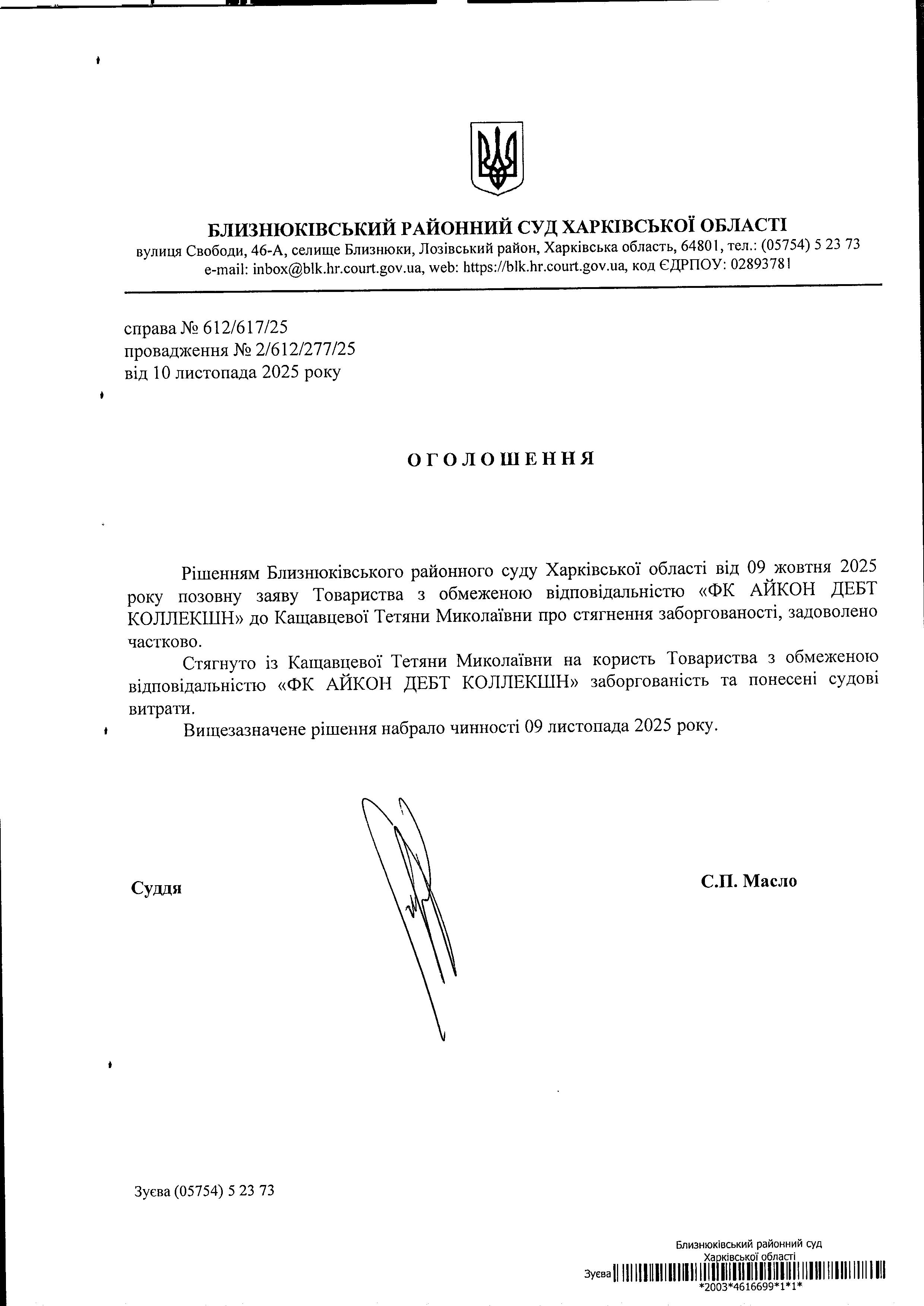 Оголошення про набрання чинності рішення суду від 09 жовтня 2025 року за позовом ТОВ "ФК АЙКОН ДЕБТ КОЛЛЕКШН" до Кащавцевої Тетяни Миколаївни про стягнення заборгованості
