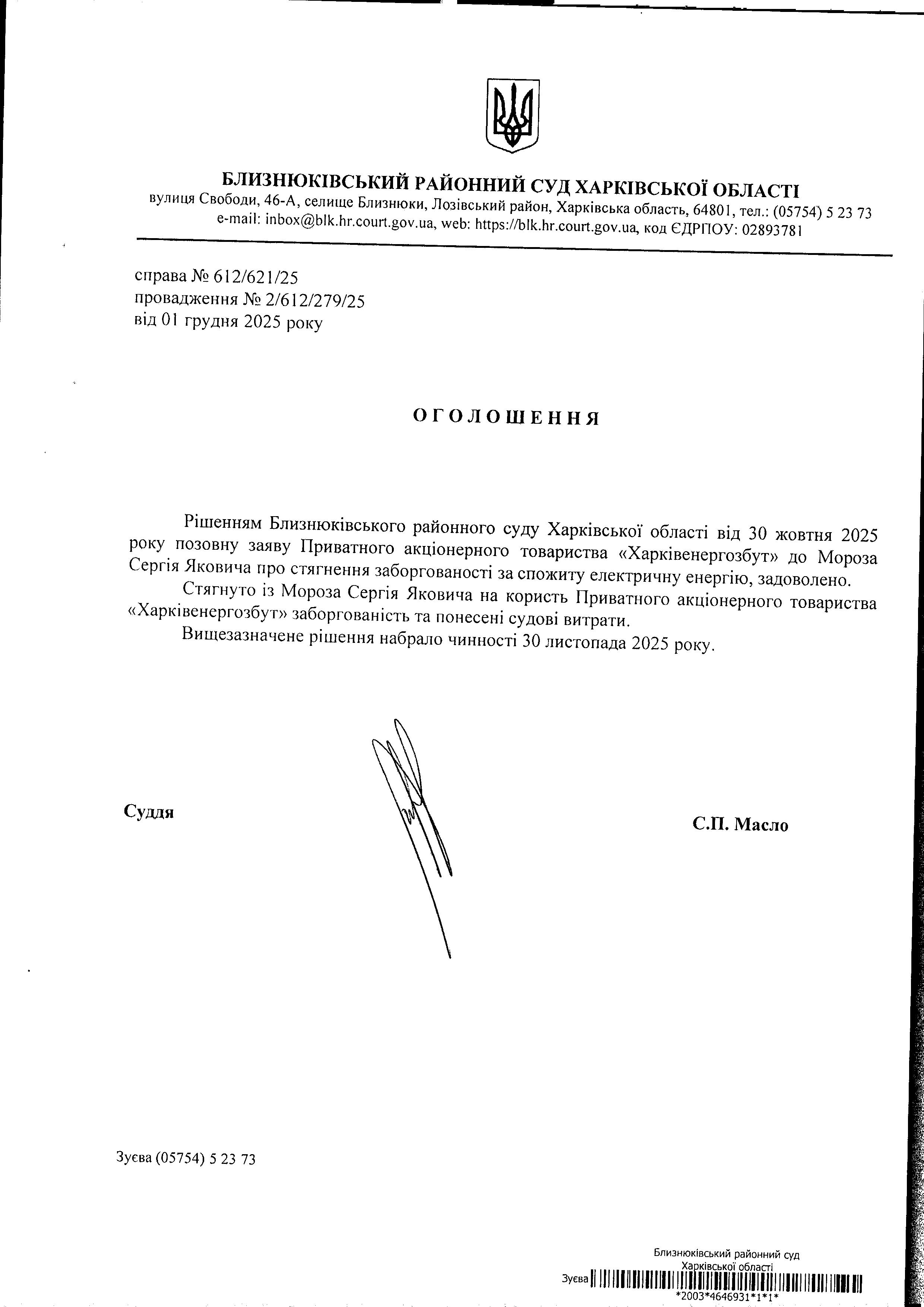 Оголошення про набрання чинності рішення суду від 30 жовтня 2025 року за позовом ПАТ "Харківенергозбут" до Мороза Сергія Яковича про стягнення заборгованості