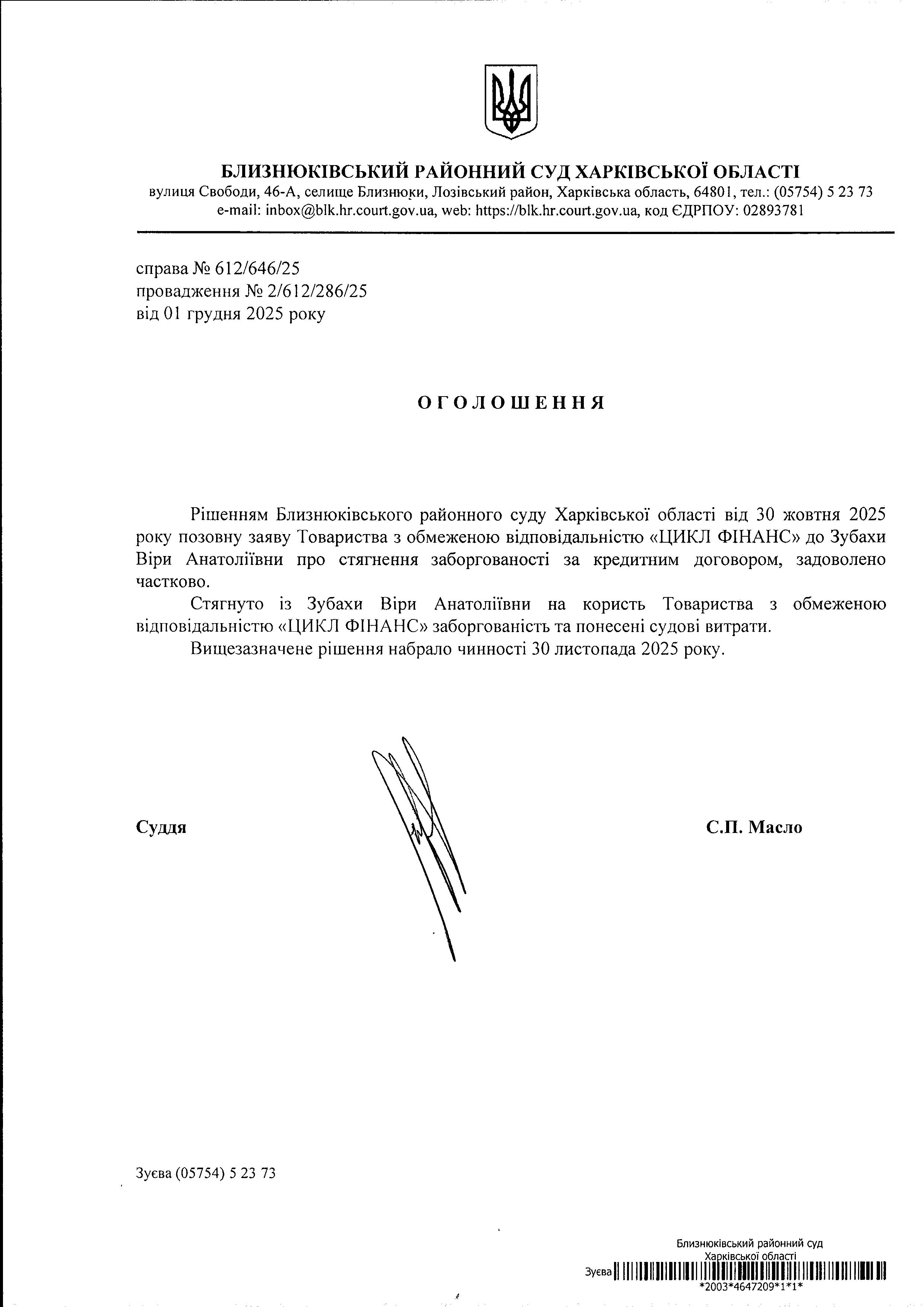 Оголошення про набрання чинності рішення суду від 30 жовтня 2025 року за позовом ТОВ "ЦИКЛ ФІНАНС" до Зубахи Віри Анатоліївни про стягнення заборгованості