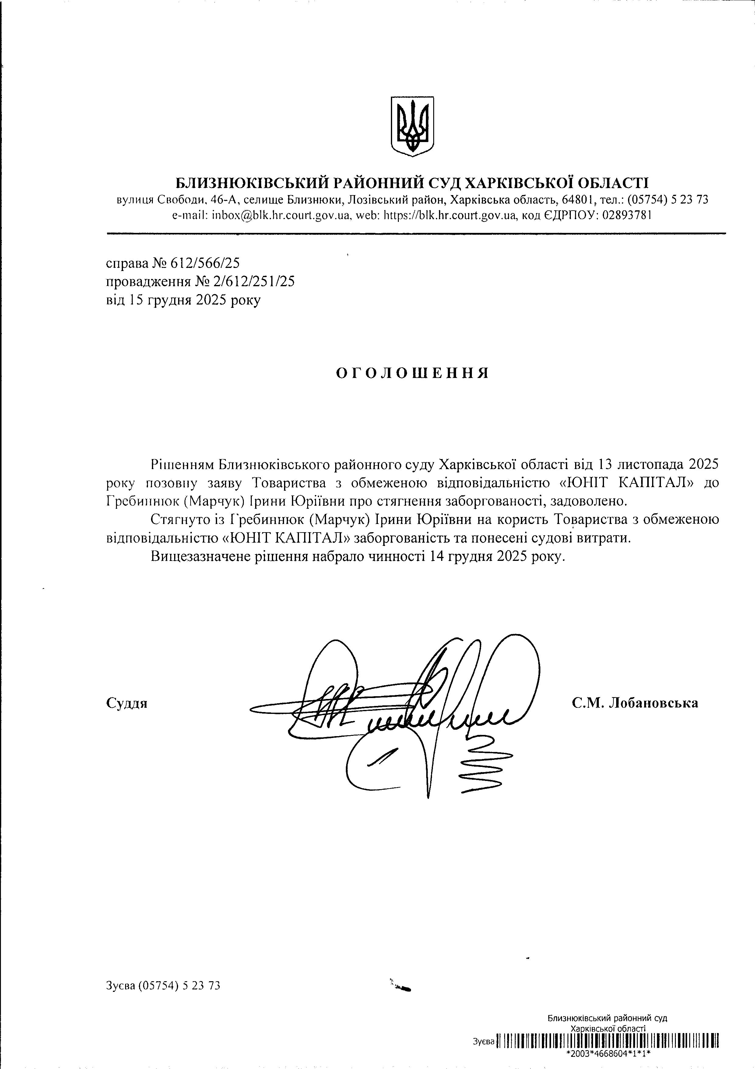 Оголошення про набрання чинності рішення суду від 13 листопада 2025 року за позовом ТОВ "ЮНІТ КАПІТАЛ" до Гребиннюк(Марчук) Ірини Юріївни про стягнення заборгованості
