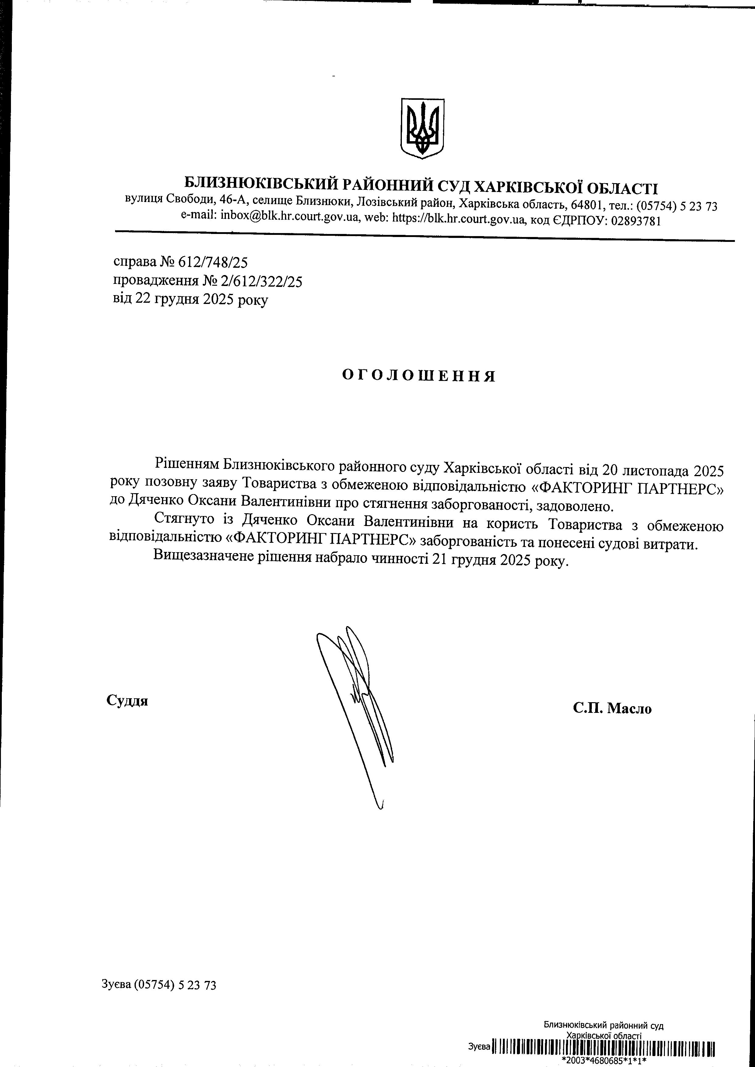 Оголошення про набрання чинності рішення суду від 20 листопада 2025 року за позовом ТОВ "ФАКТОРИНГ ПАРТНЕРС" до Дяченко Оксани Валентинівни про стягнення заборгованості