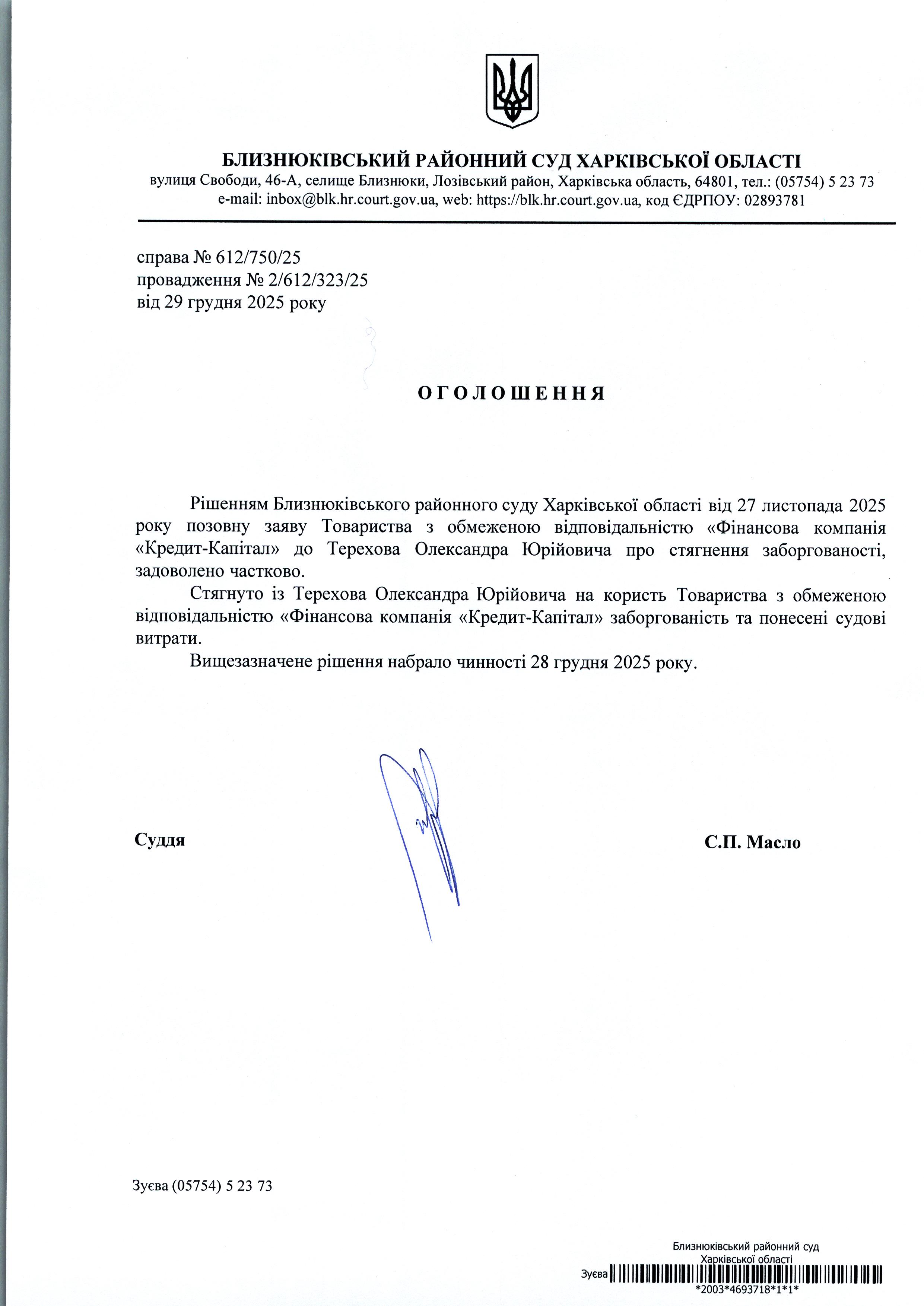 Оголошення про набрання чинності рішення суду від 27 листопада 2025 року за позовом ТОВ "Фінансова Компанія "Кредит-Капітал" до Терехова Олександра Юрійовича про стягнення заборгованості