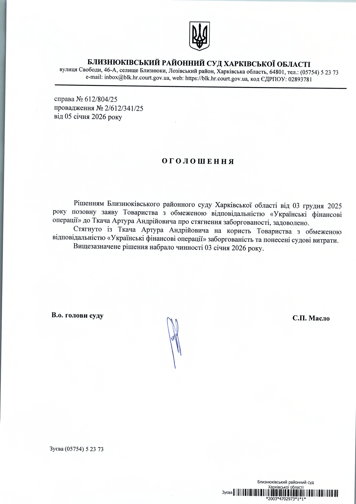 Оголошення про набрання чинності рішення суду від 03 грудня 2025 року за позовом ТОВ "Українські фінансові операції" до Ткача Артура Андрійовича про стягнення заборгованості