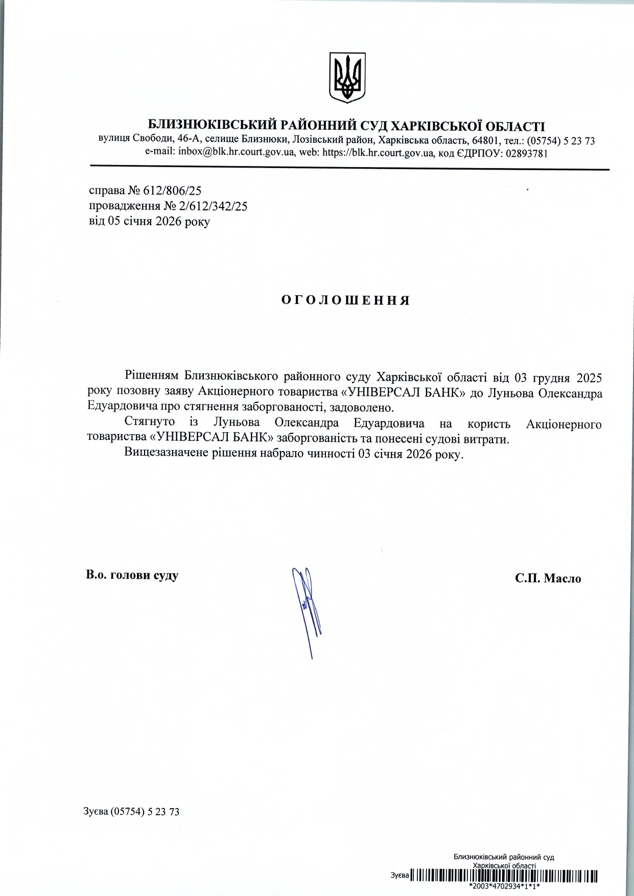 Оголошення про набрання чинності рішення суду від 03 грудня 2025 року за позовом АТ "УНІВЕРСАЛ БАНК" до Луньова Олександра Едуардовича про стягнення заборгованості