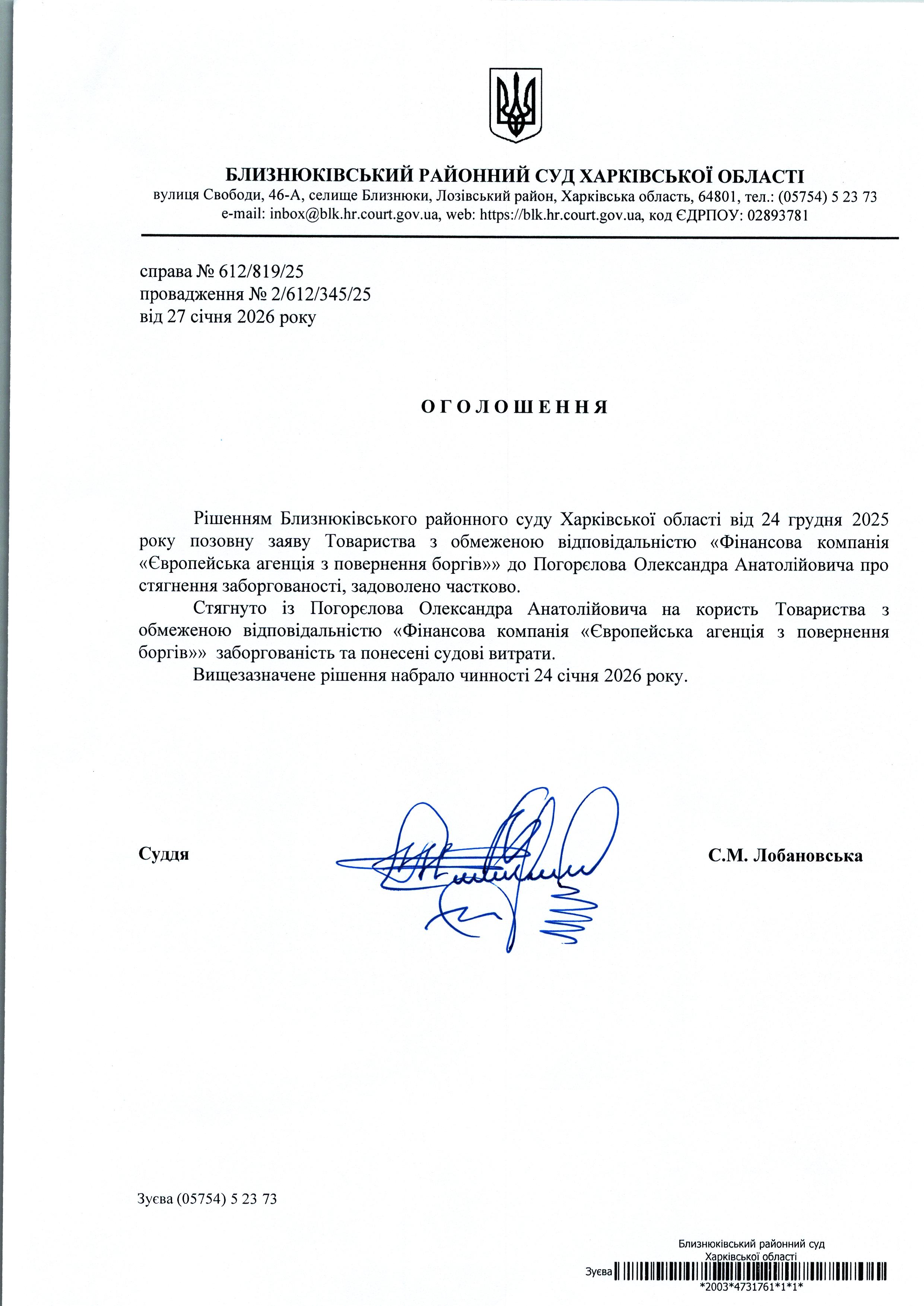 Оголошення про набрання чинності рішення суду від 24 грудня 2025 року за позовом ТОВ "Фінансова Компанія "Європейська агенція з повернення боргів" до Погорєлова Олександра Анатолійовича про стягнення заборгованості