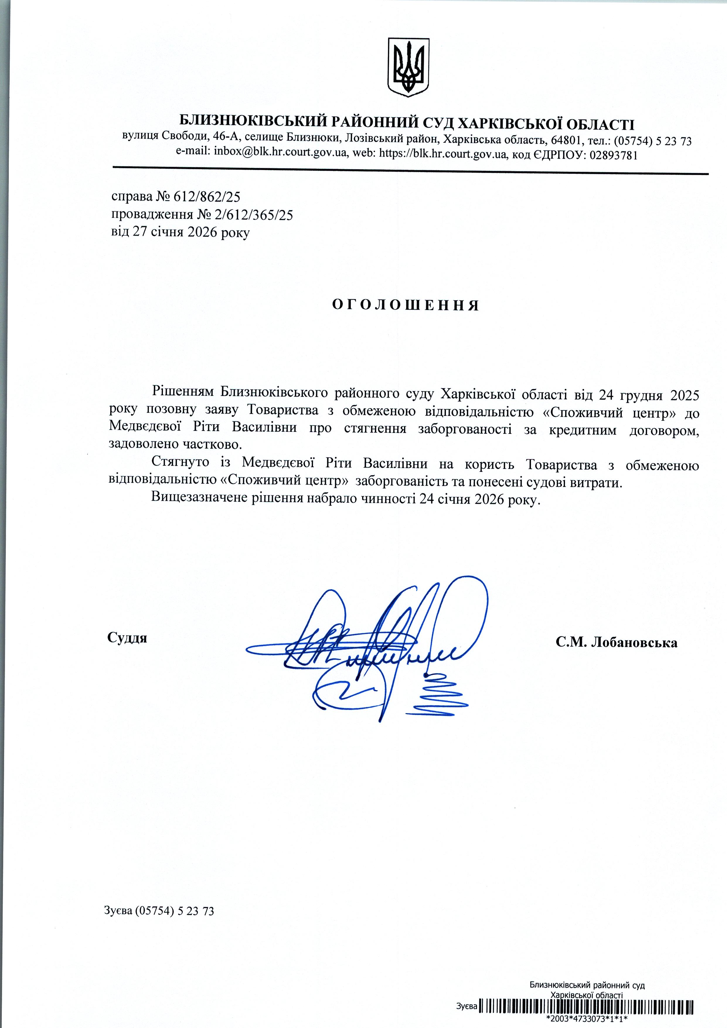Оголошення про набрання чинності рішення суду від 24 грудня 2025 року за позовом ТОВ "Споживчий центр" до Мєдвєдєвої Ріти Василівни про стягнення заборгованості
